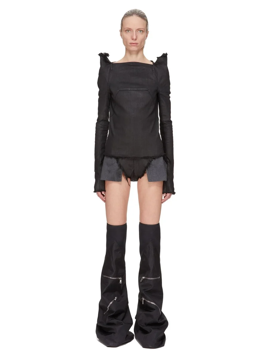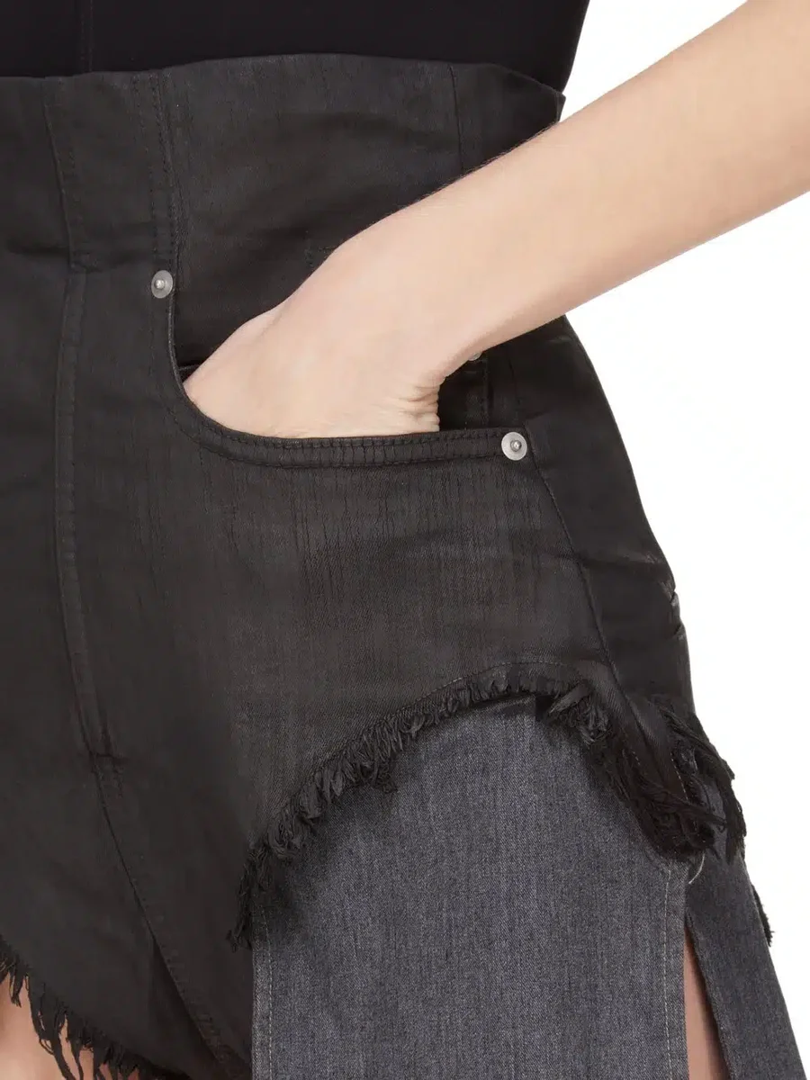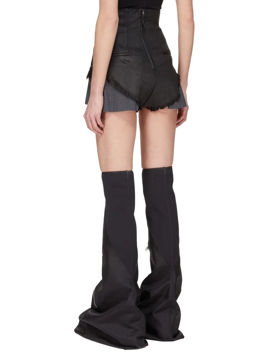 DRKSHDW FW25 CONCORDIANS DIRT CUTOFFS I SVART VAXAD STRETCHDENIM
