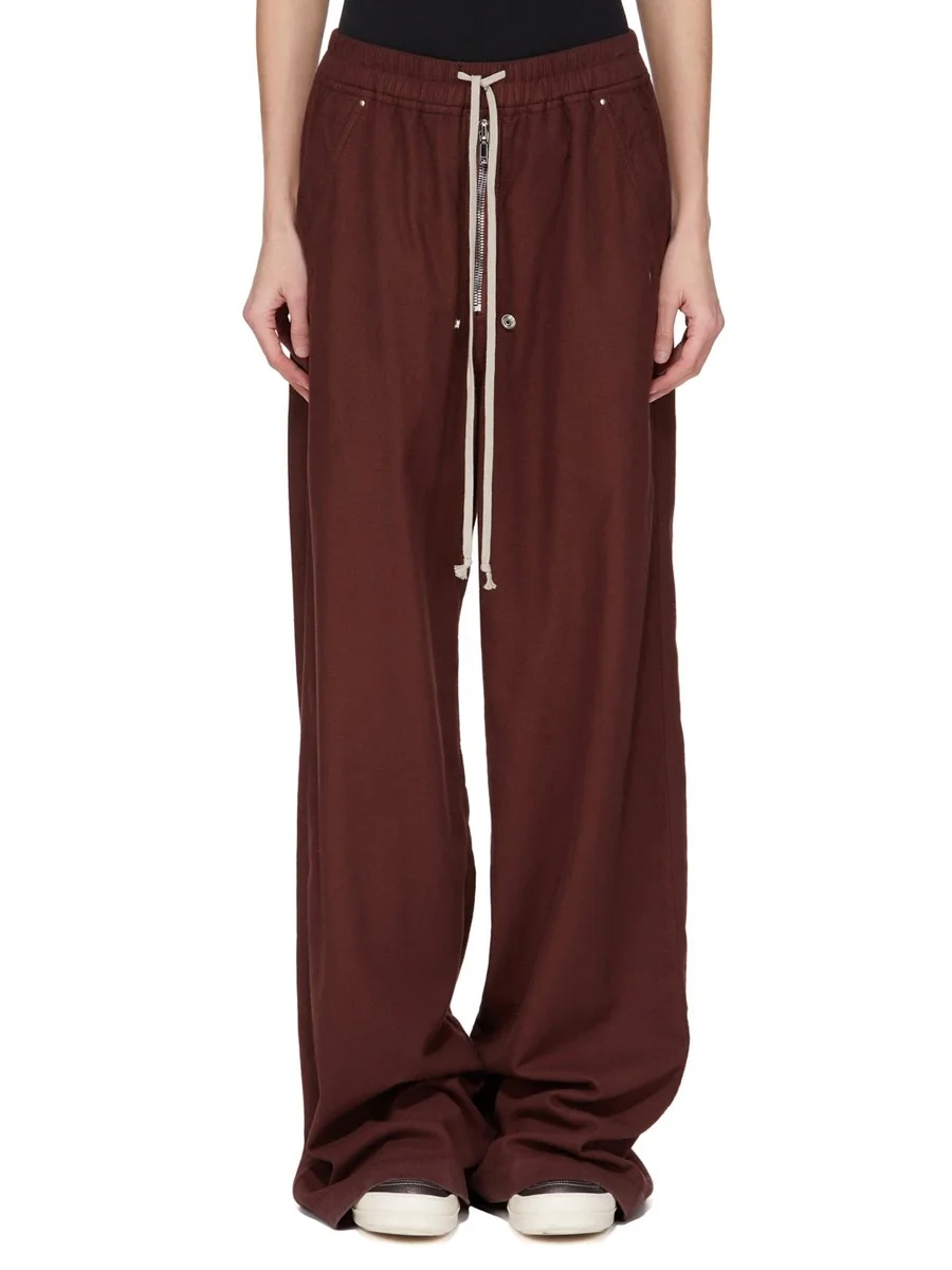 DESSA GETH BELA-BYXOR ÄR FULL LÅNGA MED LÅG GREN OCH VID BEN. DE HAR RESÅR I MIDJAN MED VERTIKALA SÖMNINGAR OCH DRAGSKNÄPP SAMT EN EXPONERAD BELA-DRAGKEDJA I MITTEN MED TVÅ KNÄPPDETALJER NEDST. DE HAR SIDOFICKOR MED ÖGLJUTNINGAR OCH NITDETALJER OCH BAKSIDFICKOR MED KLÄDDAR OCH SYNLIGA KNÄPP.