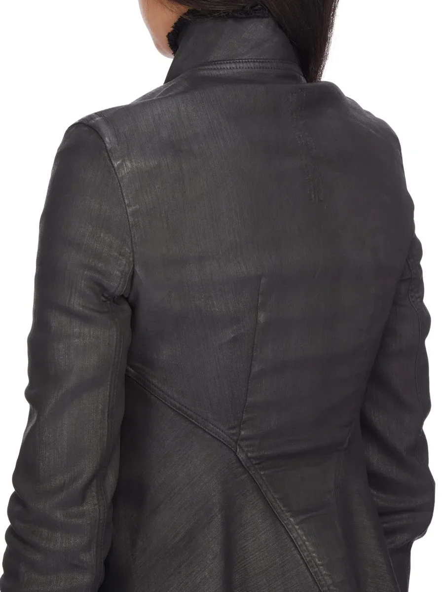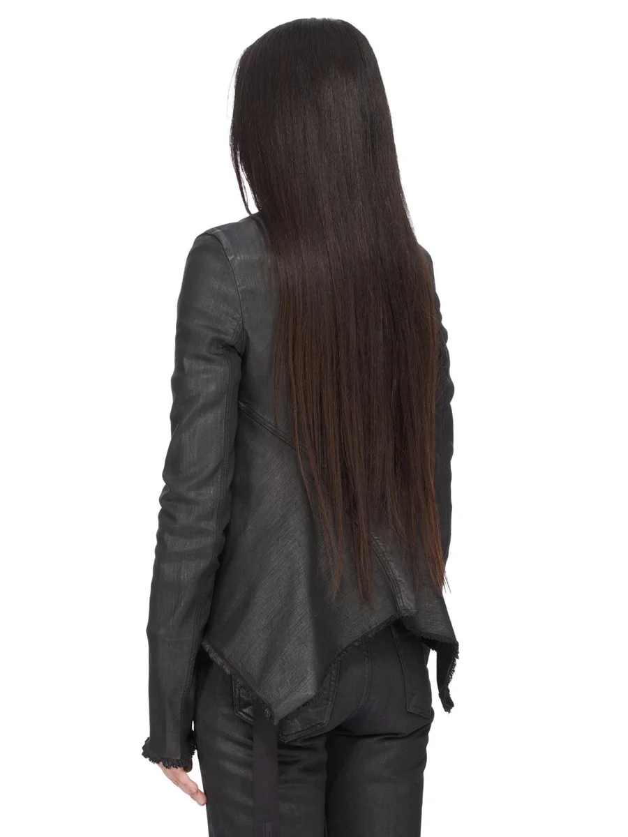 DENNA NASKA GARY JACKA ÄR LÅNG NEDOMFÖR MIDJAN MED EN TÄT PASSFORM. DEN HAR LÅNGA ÄRMAR, HÖG HALS MED ASYMMETRISK DRAGKEDJA FRAM OCH JÄMNA AXELSÖMMAR MED KANTSÖMNINGAR. DEN HAR EN SVÖJD NASKA-FÅLL SOM DELAR I TVÅ PUNKTER BAK OCH HAR RÅA SKÄRNINGAR AV FÅLLAR OCH KANTER.