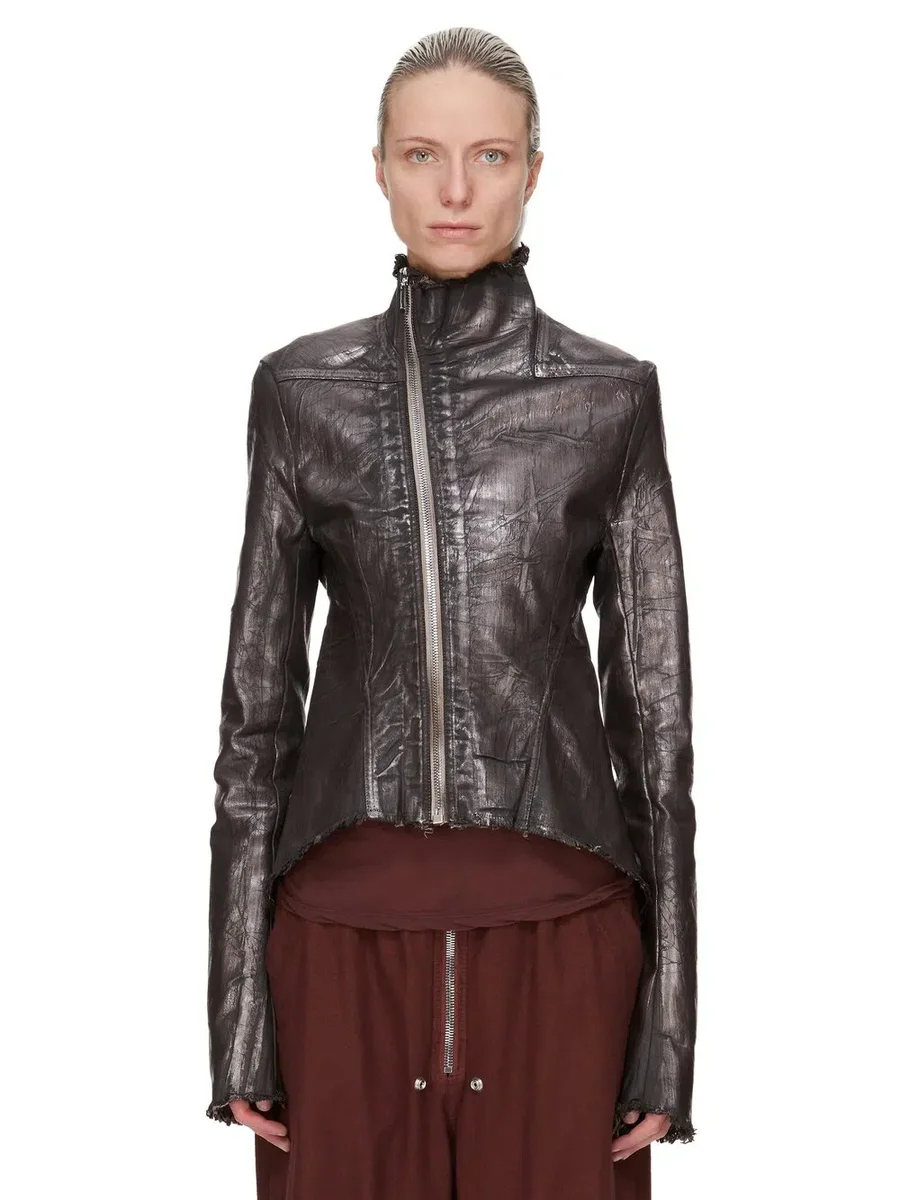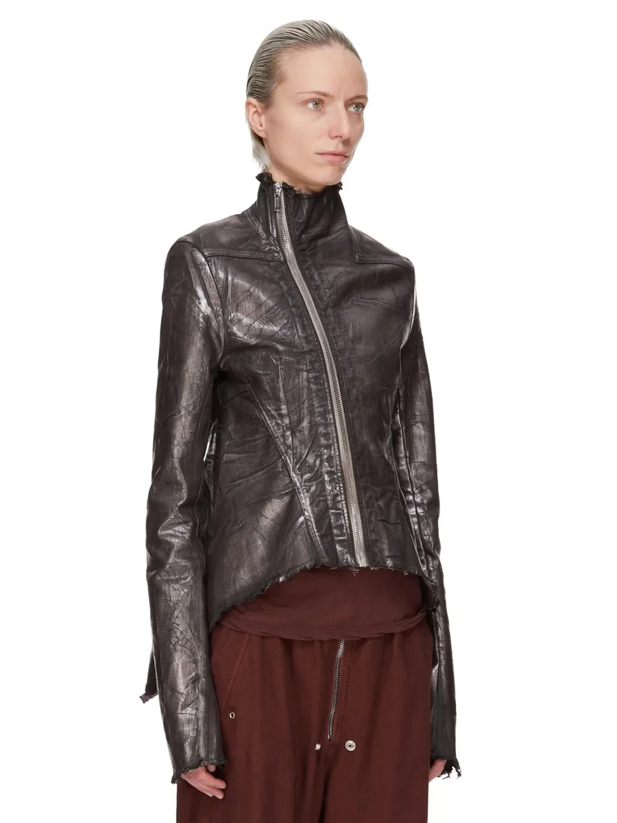 DENNA NASKA GARY JACKA ÄR LÅNG NEDOMFÖR MIDJAN MED EN TÄT PASSFORM. DEN HAR LÅNGA ÄRMAR, HÖG HALS MED ASYMMETRISK DRAGKEDJA FRAM OCH JÄMNA AXELSÖMMAR MED KANTSÖMNINGAR. DEN HAR EN SVÖJD NASKA-FÅLL SOM DELAS I TVÅ PUNKTER BAK OCH HAR RÅSKÄRDA FÅLLAR OCH KANTER.