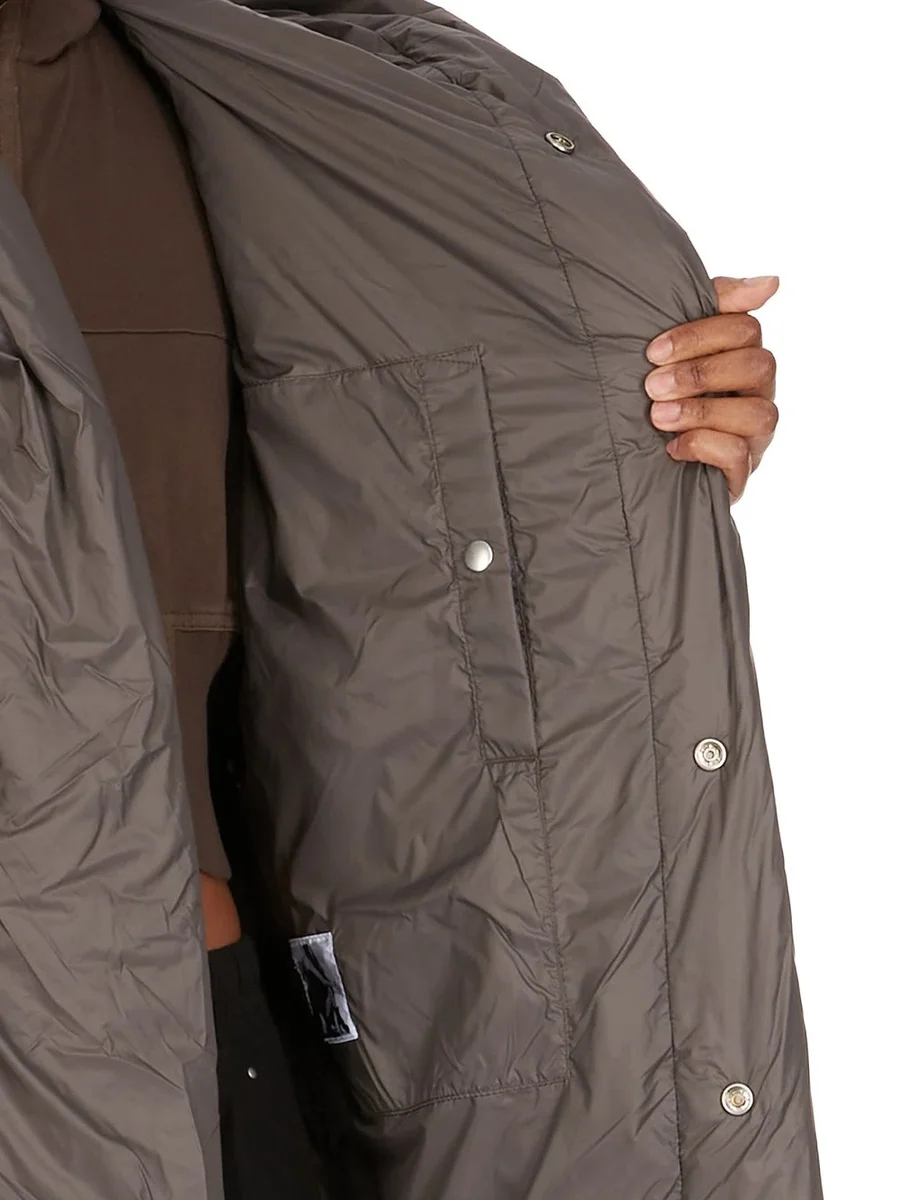 DETTA HUVINNARE ÄR ÄRMLÖST OCH NEDÅT KNÄET. DEN HAR EXTREMT SIDSTÄNGDA DOLDA KNÄPPNINGAR FRAM, HUVA, SIDOFICKOR OCH ETT BOMULLSREM MED NITDETALJER PÅ BAKSIDEN. DEN ÄR HELFODRAD MED INVÄNDIG QUILTNING OCH TVÅ KNÄPPFICKOR.