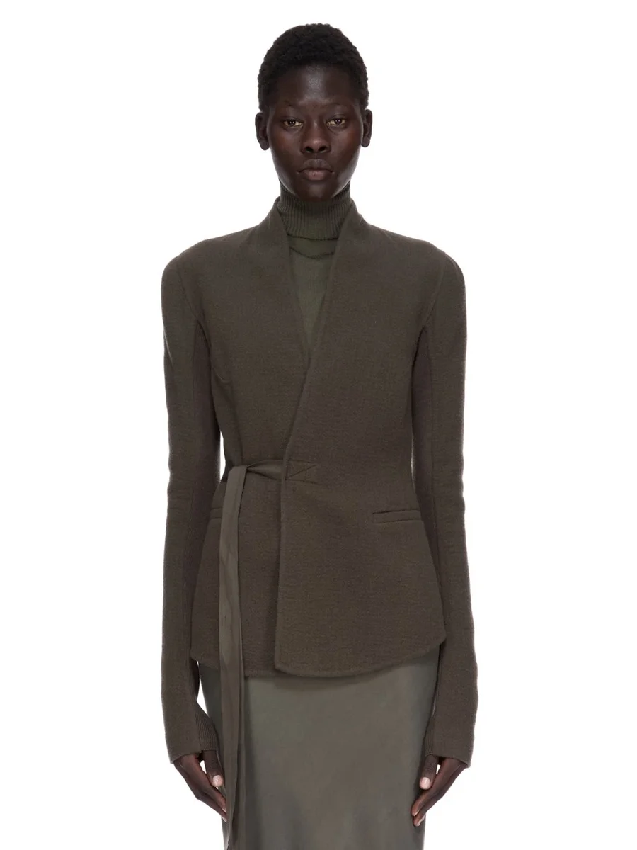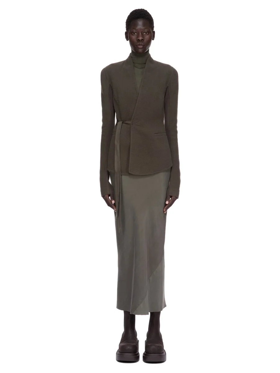 DENNA HOLLYWOOD JKT ÄR LÅNG OVER HÖFTEN MED LÅNGA, SMALDA ÄRMAR MED EN UNDERSIDA I STICKAD STOFF. DEN HAR EN KRAGEFRIA V-RINGNING MED EN DUBBELKNÄPPT FRAMSIDA SOM OMSLUTAS OCH FÄSTES MED KNYT OCH INVÄNDIG DOLD ELASTISK BÄLT. DEN HAR EN ATT SKYDDAD FORM SOM UTSVÄNDER ÖVER HÖFTEN, MED SIDOSPRISSAR BAKRÄCKT.