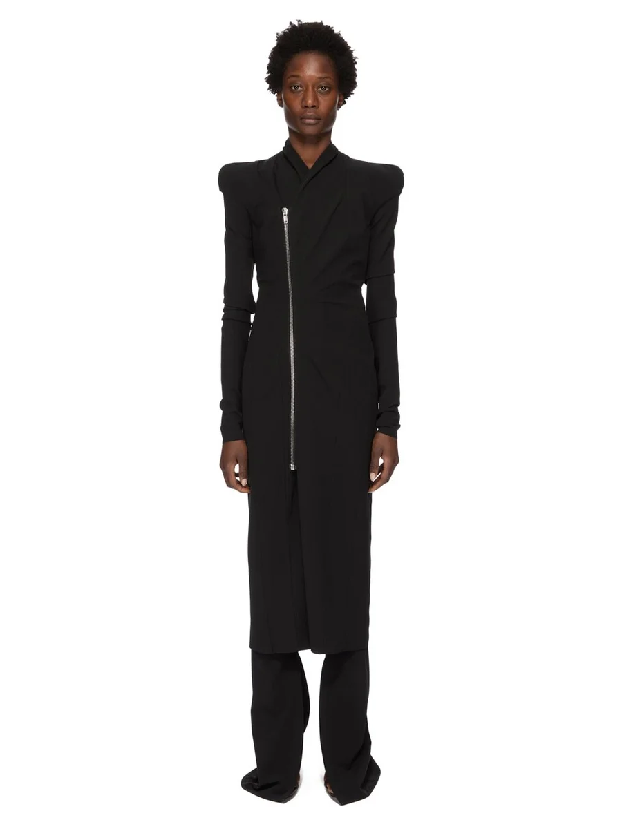DENNA PRINSESSKAPPA ÄR LÅNG NEDAN KNÄET MED LÅNGA SMALDA ÄRMAR. DEN HAR EN EXTREM DRAGKEDJA FRAM TILL ÖVERSTÅENDE LÅR, EN SJALLIKNANDE HALS OCH STRUKTURERADE AXLAR. DEN HAR SJÖDETALJER BAK OCH EN MITTSÖM BAK NER LÄNGS RYGGEN.