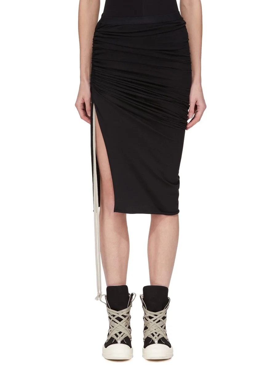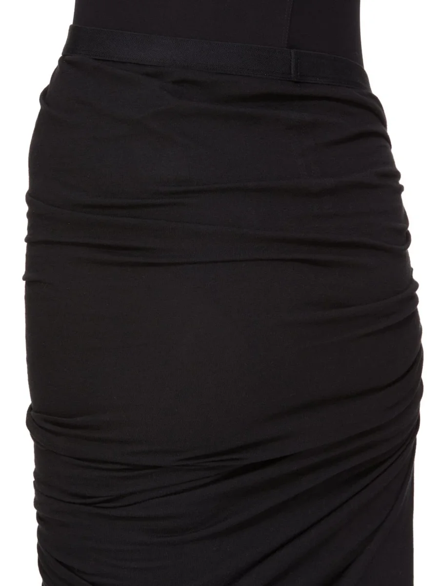 DENNA MJUKA EDFU-KJOL I KNÄ ÄR KNÄLÅNG. DEN HAR RESÅR I MIDJAN OCH EN TÄJD PASSFORM. DEN DRAPERAR OCH SLUTAR RUNT HÖFTEN OCH SAMLES TILL EN SÖM PÅ HÖGER LÅR. SIDSPLITTEN KAN MODIFIERAS MED DRAGSNÖRNINGEN. EN HÖGRE ELLER LÄGRE SPLIT GER ÖKAD DRAPERING OCH RYNGNING.