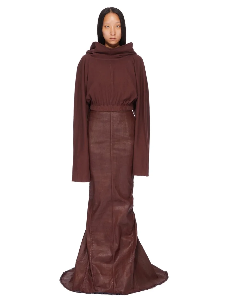 DENNA LIDO-KJOL ÄR GOLFLÅNG MED EN TÄJD PASSFORM. DEN HAR EXTRA HÖG MIDJA MED MIDJEBAND, DRAGKEDJA BAKA MED FLIK, SIDFICKOR OCH EN AVSAMANNANDE KJOL SOM UTSTÄNDS FRÅN KNÄET MED EN SKINN I MITTSÖMMEN BAKA.