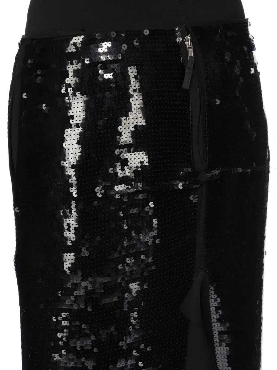 DENNA SLICED KJOL ÄR GOLFLÅNG I SIDORNA. DEN HAR DRAGKEDJA MITTBAK OCH EN TAJ PASSFORM. DEN HAR TVÅ HÖGA SLISSAR FRAM OCH BAK SAMT RÅDDETALJER MED STYCKNINGAR FRAM OCH BAK. DEN HAR SIDSÖMMAR I FICKOR.