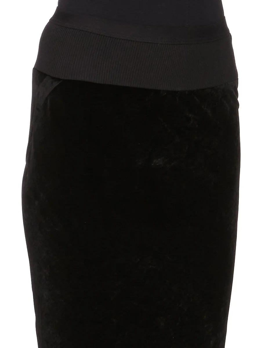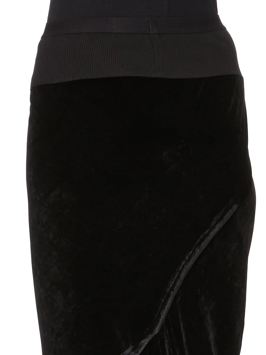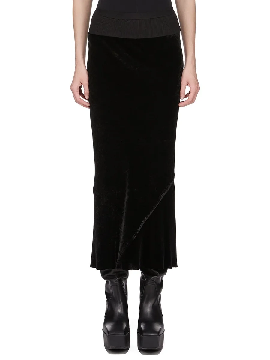 DENNA VADKJOL ÄR LÅG VAD LÅNG MED BRED MUDD OCH RESÅR I MIDJAN. DEN UTSVÄNGER LÄTT FRÅN KNÄET OCH HAR EN DIAGONALT SKJUTEN SÖM MED DRAPERAD INSÄTTNING PÅ VÄNSTER BAK.