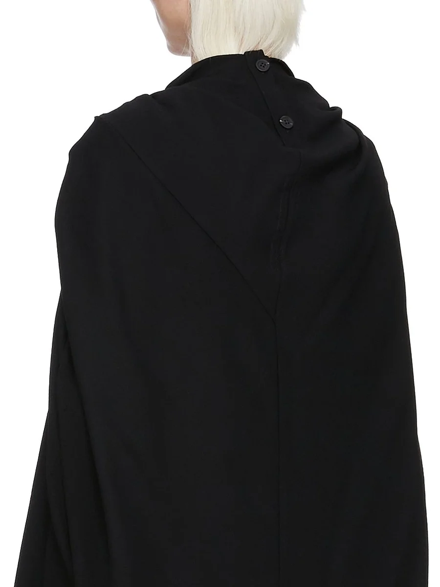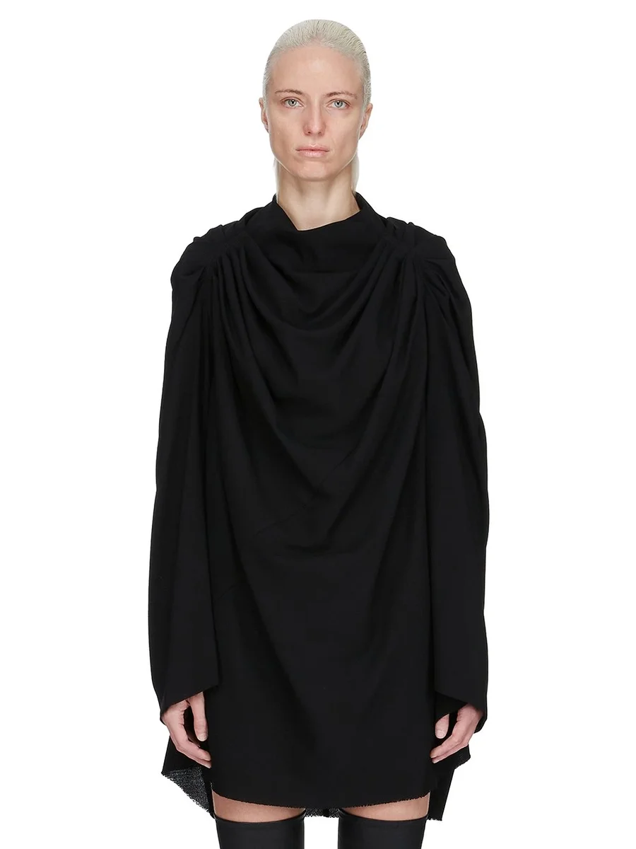DENNA CLAUDETTE MINI ÄR LÅRET TILL MITT FRAM OCH ÄR NÅGOT LÄNGRE BAK. DEN HAR LÅNGA, BREDA ÄRMAR OCH SIDOÖPPNINGAR SÅ ATT ÄRMEN KAN BÄRAS IN ELLER UT. DEN HAR EN RYCKAD, RUNDAD HALS SOM SKAPAR FLERA VECKOR VID AXELN, EN SKJUTEN SÖM SOM LÖPER ÖVER BRÖSTET FRAM OCH BAK, SAMT DRAPERAR FRAM OCH BAK SAMT EN RUNDAD, RYGG FORM OCH KNAPPAD HALSKNÄPPNING BAKRÄCKT.