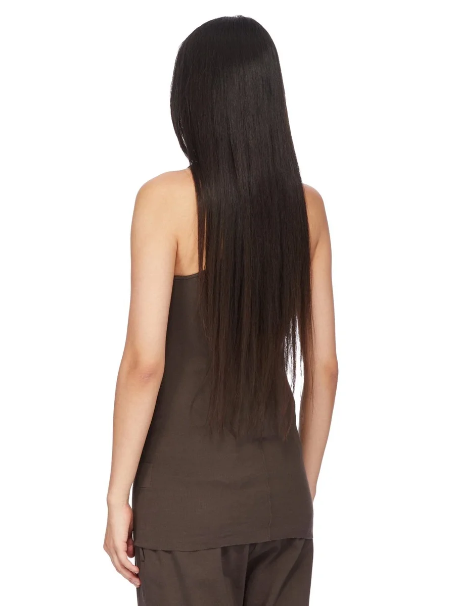 DETTA RACER BACK-LINNE ÄR HÖFTLÅNGT MED EN RAK, RÅ SKUREN FÅLL. DET HAR EN RUND HALSNING OCH TUNNDA AXELREMMAR SOM ÖVERGÅR I EN RACER BACK. DET HAR DEN KARAKTISKA ENKLA SÖMMEN SOM LÖPER NER LÄNGS MITTERRYGGDEN.