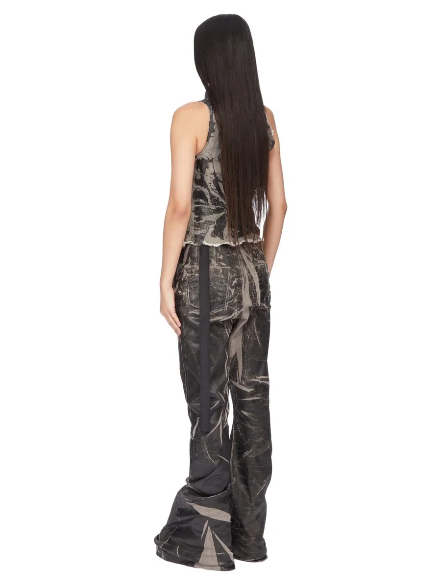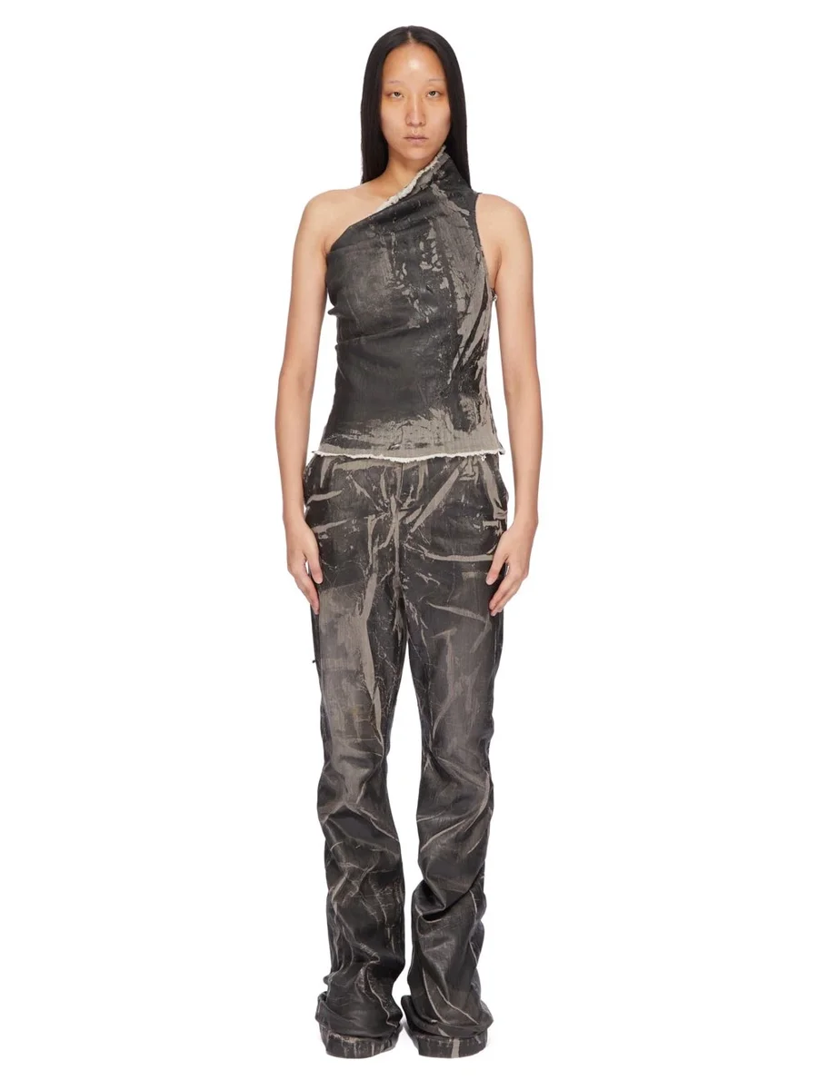 DENNA LÄTTA, TÄTTAD FOIL-DENIM ÄR TILLVERKAD PÅ EN 283 g SVART OCH NATURLIG STRETCHDENIM. DET FÄRDIGA PLAGGET BLEKAS TILL EN SMUTSIGA PÄRLEFÄRG, ETT SVART FOLIEÖVERLÄGG APPLICERAS SEDAN OCH SLUTLIGEN TVÄTTAS PLAGGET FÖR ATT UPPNÅ DET OREGELBUNDNA UTSEENDE.