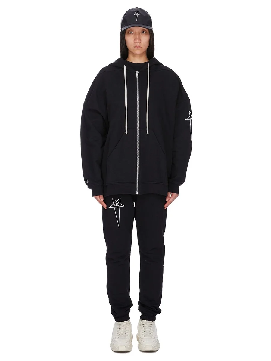 DEN HAR EN 3D-BRODERAD CHAMPION X RICK OWENS PENTAGRAM-LOGO PÅ VÄNSTER ÖVERARM OCH CHAMPION-LOGO PÅ HÖGER HANDLED.