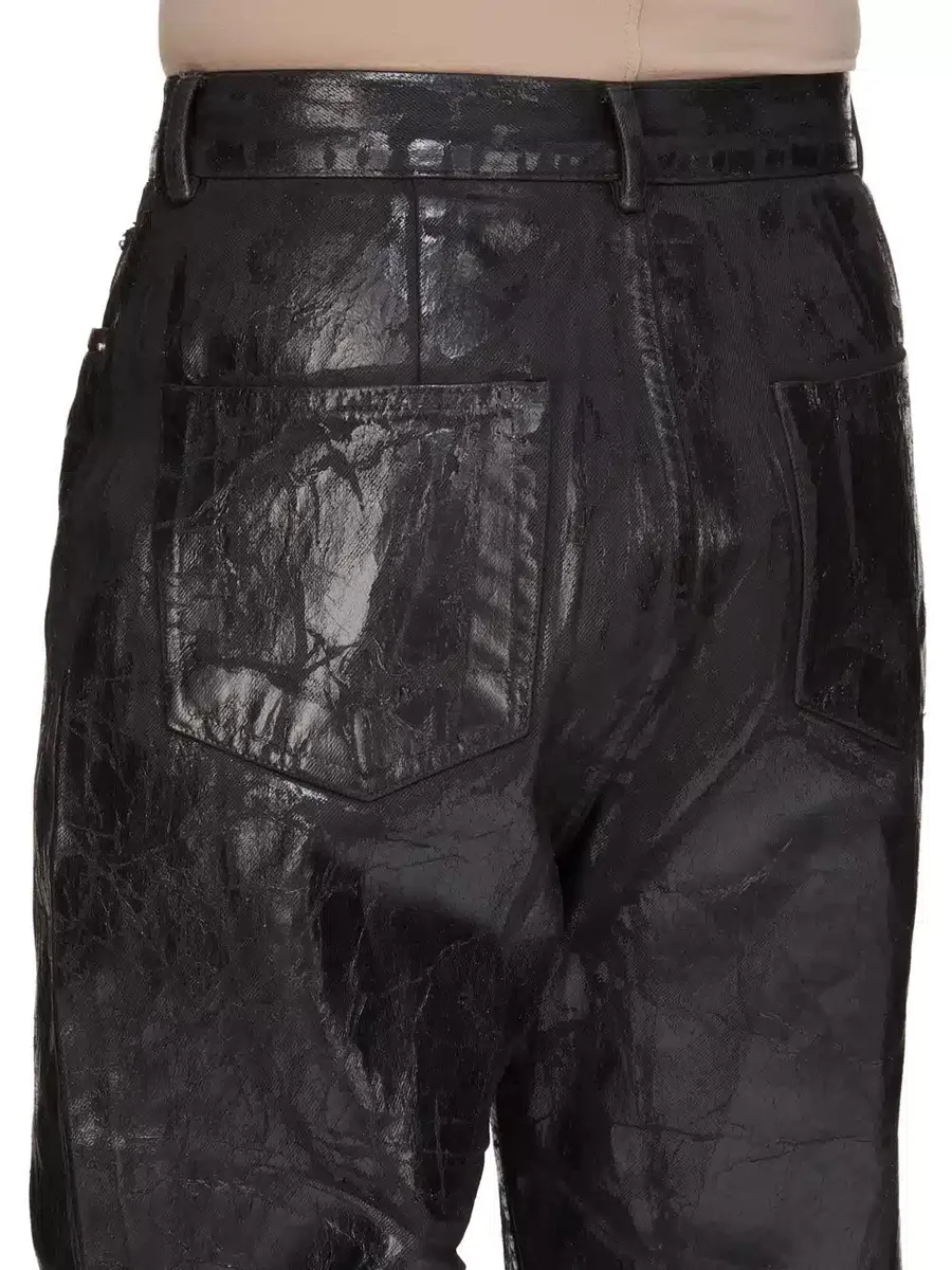 DENNA MEDELVIKTA MEGACRUST-DENIM ÄR TILLVERKAD PÅ EN 13OZ SVART OCH NATURLIG JPDENIM. DET FÄRDIGA PLAGGET ÖVERFÄRGAS SVART OCH BEHANDLAS MED EN VAXFINISH, SEDAN PRESSAS FLERA LAGER AV SVART FOLIE ÖVERST OCH EN SISTA TVÄTT GÖR ATT FOLIEN SKALAR AV OCH SPRICKAR.