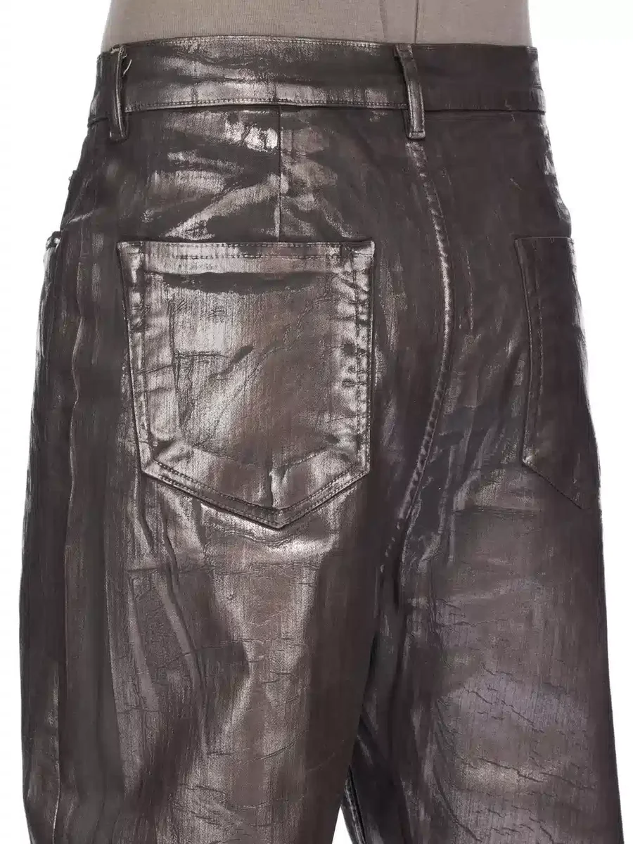 DENNA LÄTTVIKTIG BRONS MEGACRUST DENIM ÄR TILLVERKAD PÅ EN 283 g SVART OCH NATURLIG STRETCH DENIM. DET FÄRDIGA PLAGGET ÄR ÖVERFÄRGAT MED MÖRKT STAV OCH BEHANDLAS SEDAN MED LAGER AV BRONSFÄRGAD FOLI SOM PRESSAS PÅ FÖR HAND.