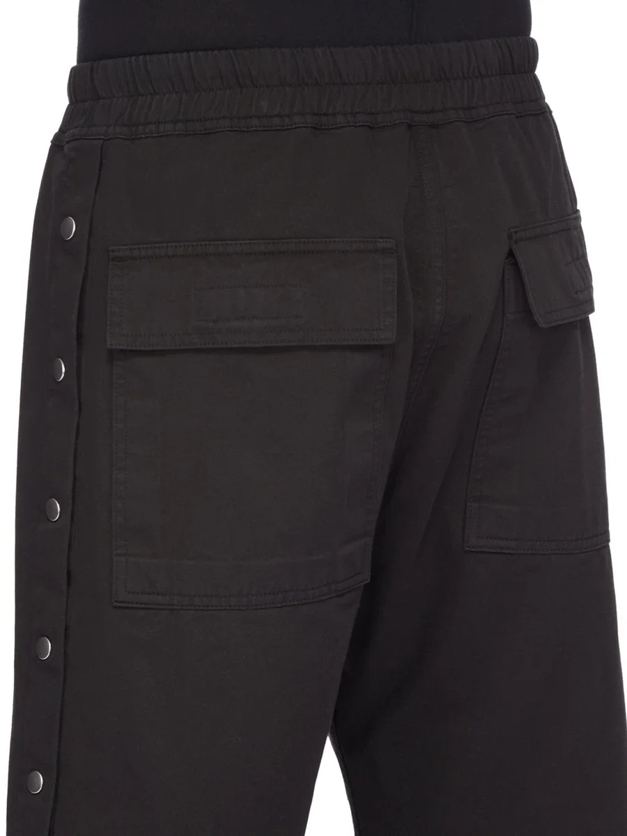 DESSA PUSHER SHORTS ÄR KNÄLÅNGA MED VID BEN OCH LÄTT NEDSÄNKT GREN. DE HAR RESÅR I MIDJAN MED DRAGSKNÖRNING, FICKOR PÅ SIDORNA OCH FYRKANTIGA BAKSIDOR MED KANTSÖMNING. DE HAR SYNLIGA KNÄPP SOM LÖPER NER PÅ YTTRE BENET SÅ ATT DE KAN KNÄPPAS UT OCH BÄRAS ÖPPNA.