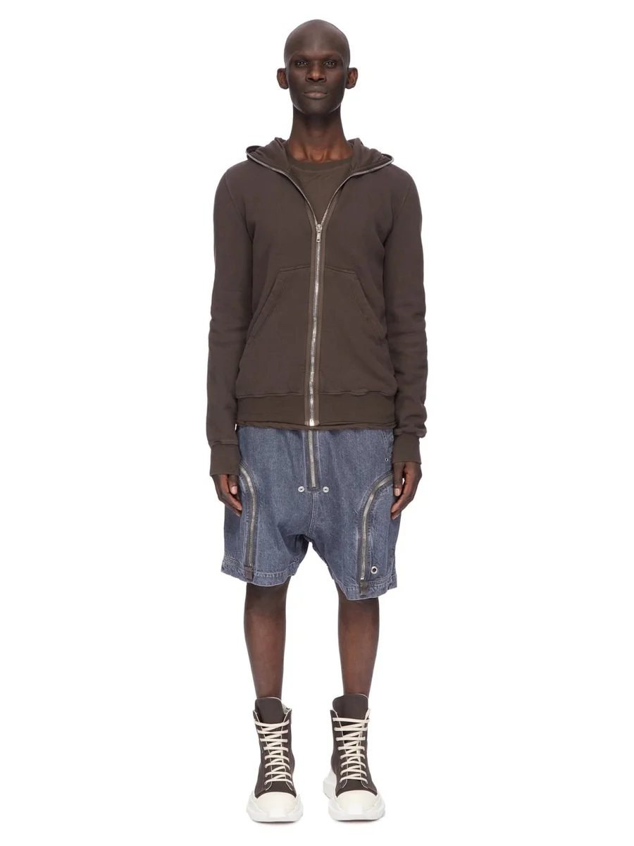 DESSA BAUHAUS SHORTS ÄR KNÄLÅNGA MED LÅGT NEDSÄTT GREN. DE HAR RESÅR I MIDJAN MED DRAGSKNÄRNING OCH SIDOFICKOR. DE HAR RUNDA BAUHAUS-FICKOR MED DRAGKEDJOR, VÄVFLICK OCH ÖGLEDETALJ PÅ FRAMLÅRET. DE HAR BAKSTICKFICKOR MED KNÄPP.