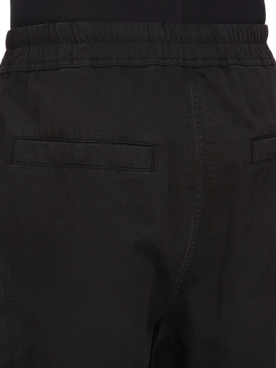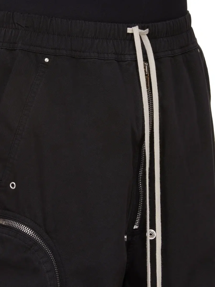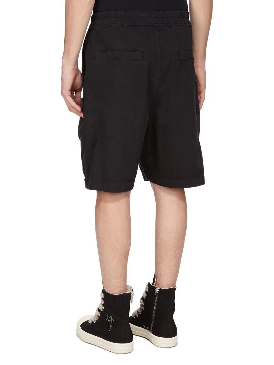 DESSA BAUHAUS SHORTS ÄR KNÄLÅNGA MED LÅGT NEDSATTA GRENTBAND. DE HAR RESÅR I MIDJAN MED DRAGSKNÄRNING OCH SIDOFICKOR. DE HAR RUNDA BAUHAUS-FICKOR MED DRAGKEDJOR, FLIK I VÄVDEL OCH ÖGLEDETALJ PÅ FRAMLÅRET. DE HAR BAKSTICKFICKOR MED KNÄPP.