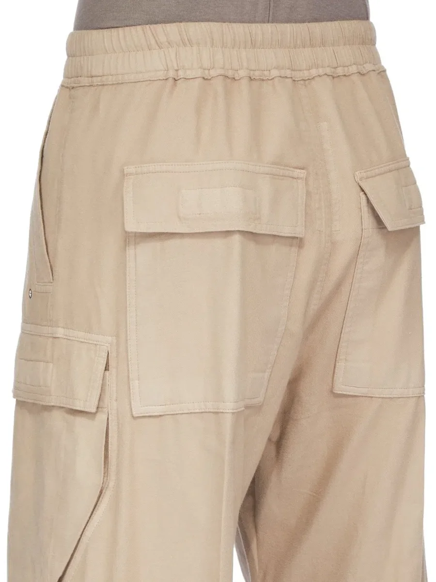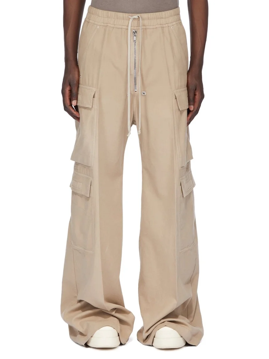 DESSA DUBBLA CARGO JUMBO-BYXOR MED BELA-BYXOR ÄR FULL LÅNGA MED LÅG GREN OCH VID BEN. DE HAR RESÅR I MIDJAN MED DRAGSNÖRNING OCH EN EXPONERAD BELA-DRAGKEDJA I MITTEN MED TVÅ KNÄPPDETALJER SAMT SIDOPADSIDA FICKOR MED NITAR. DE HAR TVÅ FASAD LARGO-FICKOR PÅ LÅRET, TVÅ FYRKANTIGA LARGO-FICKOR NEDFÖR OCH TVÅ FYRKANTIGA BAKSIDOR. ALLA HAR FLICKOR OCH KANTSÖMNING.