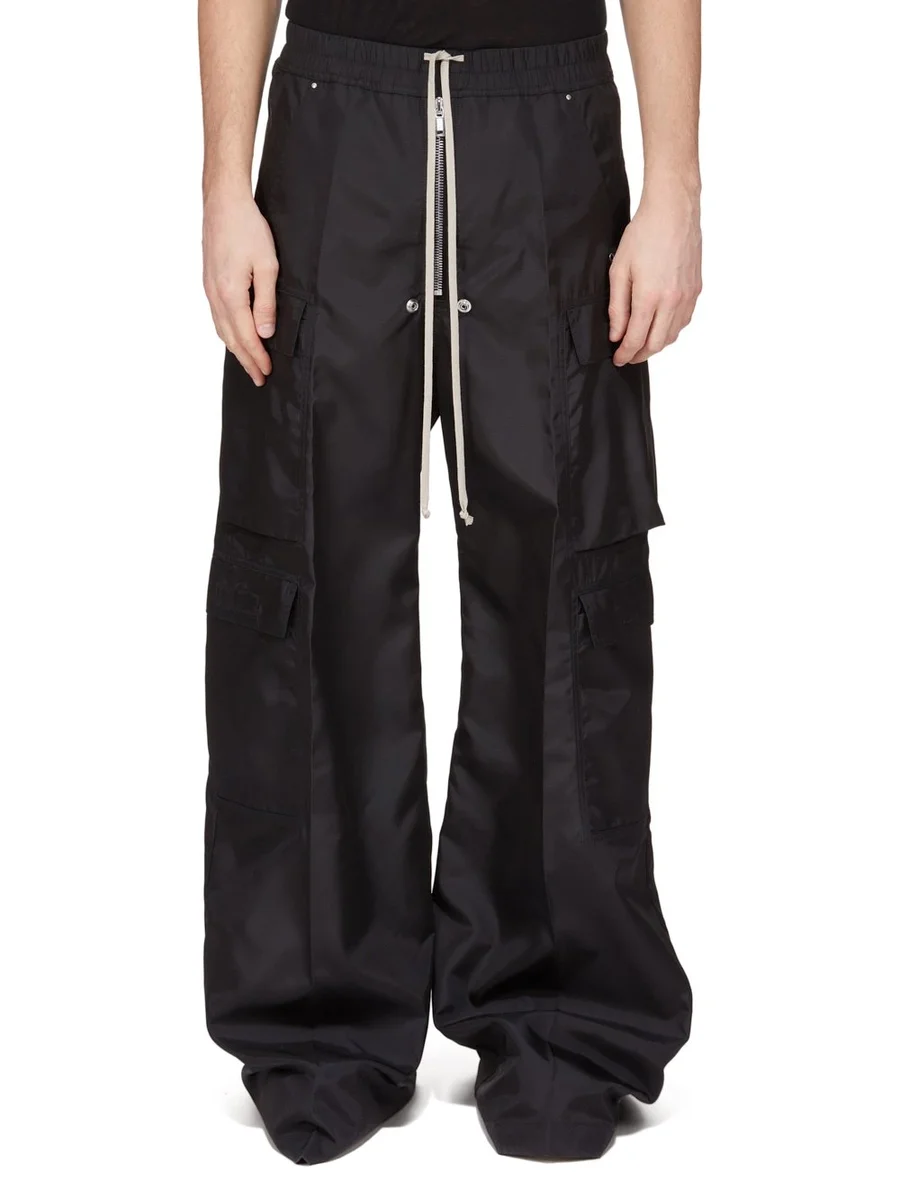 DESSA DUBBLA CARGO JUMBO-BYXOR MED BELA-BYXOR ÄR FULL LÅNGA MED LÅG GREN OCH VID BEN. DE HAR RESÅR I MIDJAN MED DRAGSNÖRNING OCH EN EXPONERAD BELA-DRAGKEDJA I MITTEN MED TVÅ KNÄPPDETALJER SAMT SIDOPADSIDA FICKOR MED NITAR. DE HAR TVÅ FASAD LARGO-FICKOR PÅ LÅRET, TVÅ FYRKANTIGA LARGO-FICKOR NEDFÖR OCH TVÅ FYRKANTIGA BAKSIDOR. ALLA HAR FLICKOR OCH KANTSÖMNING.