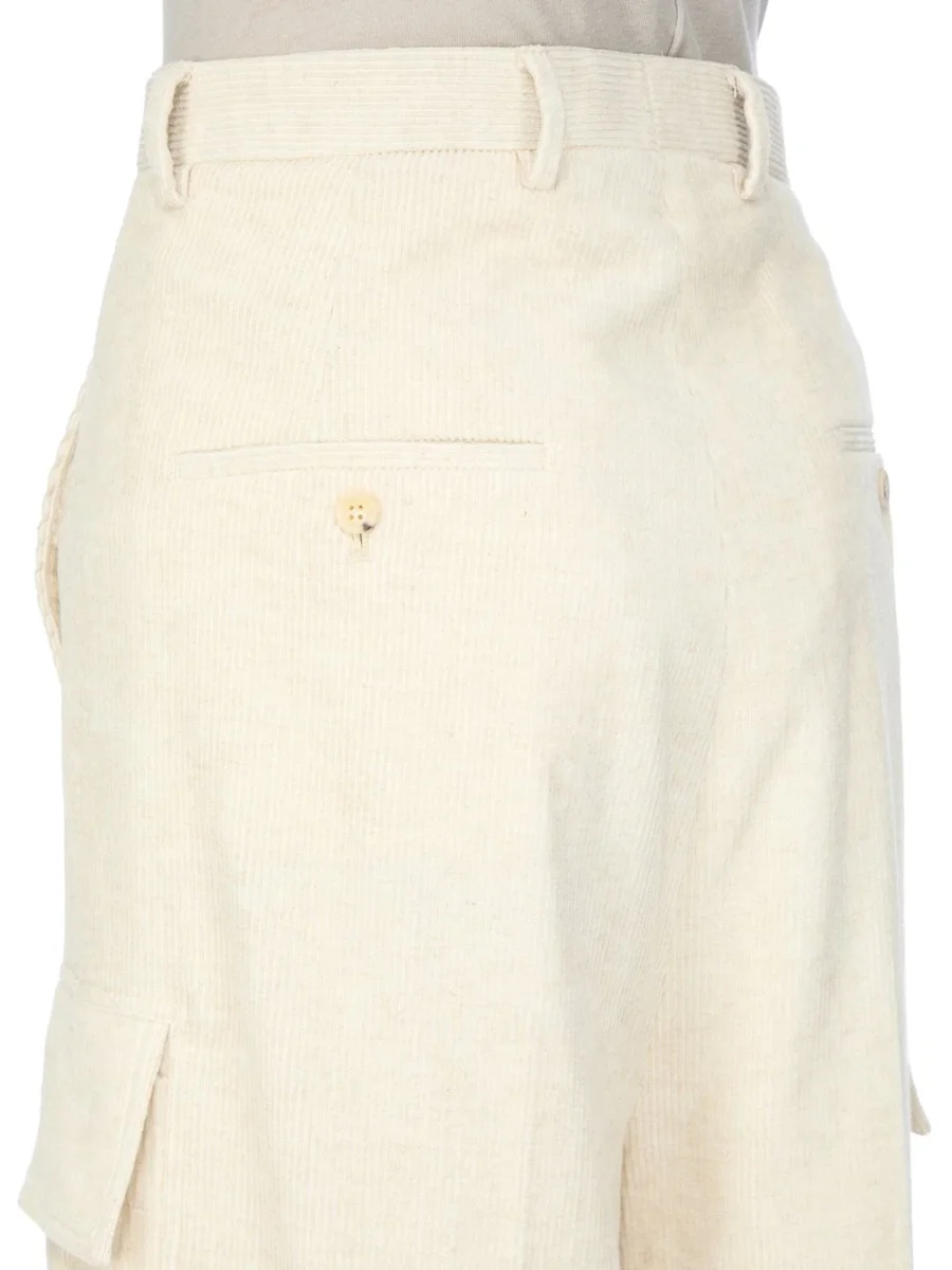 DESSA FIRBANKS ÄR GOLFLÅNGA MED TVÅ STORA LÅRFICKOR MED KLAPPAR PÅ UNDRE LÅRET. DE HAR EN MIDJANNING MED DOLD DRAGKEDJA OCH BÄLTESHÄLLOR, SIDFICKOR OCH BAKSFICKOR MED KNAPPAR.