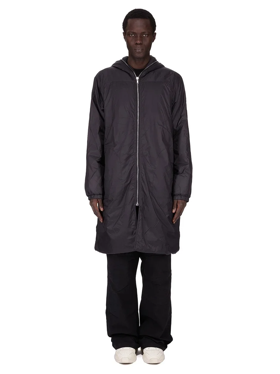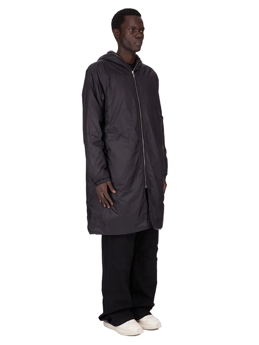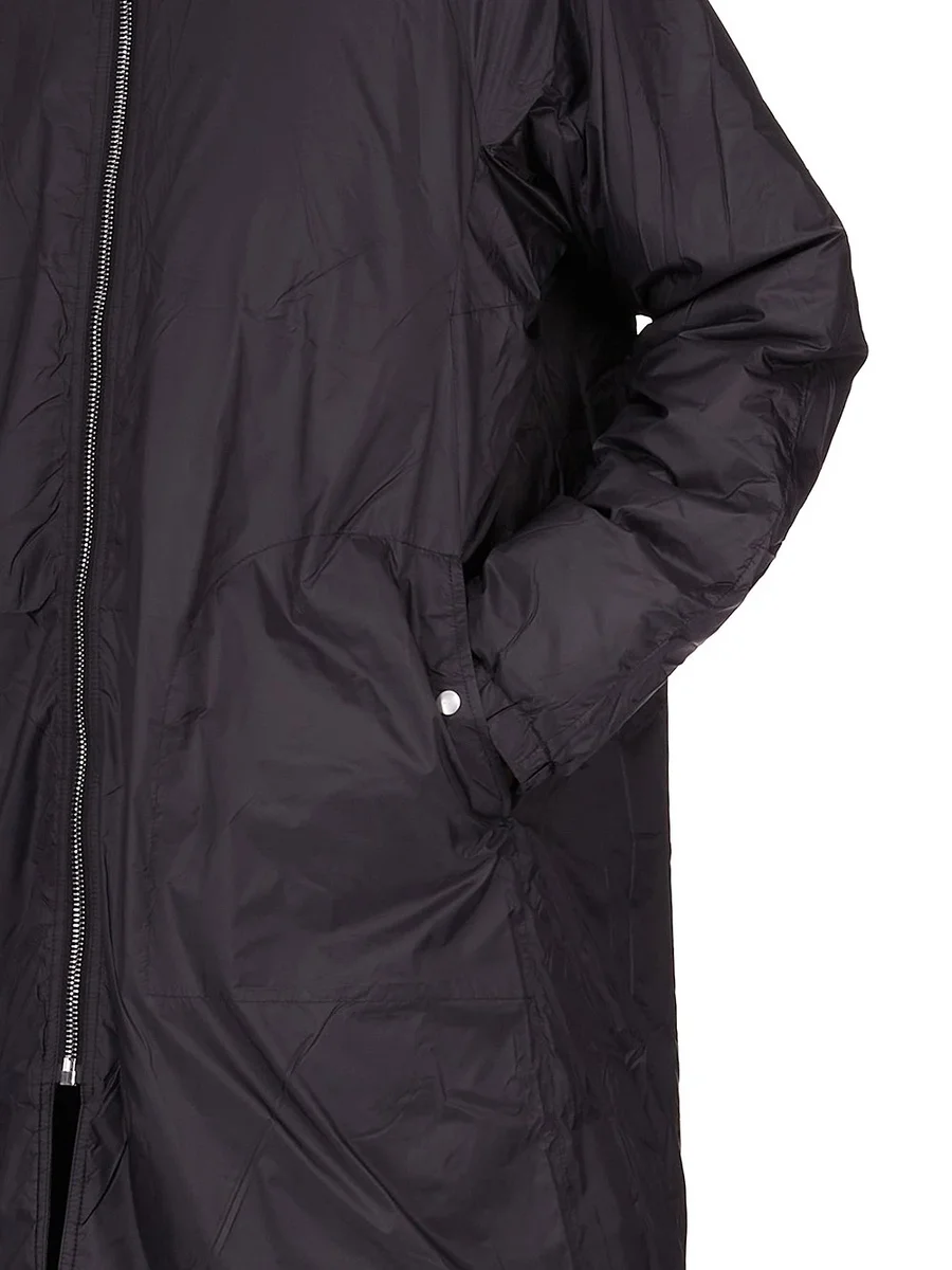 DENNA FÖRSLUTEN VINDJACKA ÄR KNÄLÅNG MED LÅNGA ÄRMAR. DEN HAR EN DRAGKEDJA I MITTFRAM SOM LÖPER UPP OCH RUNT HUVAN, SÅ ATT DEN KAN STÄNGAS HELT ÖVER ANSIKTET. DEN HAR TVÅ STORA SIDFICKOR FRAM MED RUNDADE KNÄPPSÖMNINGAR OCH SYNLIG KNÄPPKNÄPPNING, TYPISKT MITTSÖMM FRÄM SAMT RESÅR I MUDDEN OCH FÅLL. DENNA VERSION ÄR VADDRADE OCH HAR INRE KNÄPPFICKOR.