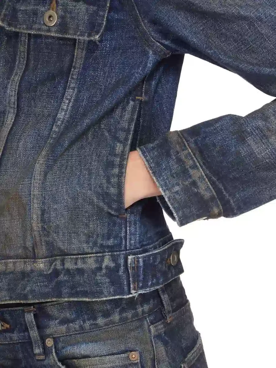 DENNA TJOCKA 473 G INDIGO-DENIM HAR EN VINTAGE-BEHANDLING, APPLICERAD PÅ DET FÄRDIGA PLAGGET, SKAPAD FÖR HAND I KURASHIKI CITY, OKAYAMA PREFEKTUR, JAPAN, AV SHAVE CO LTD.