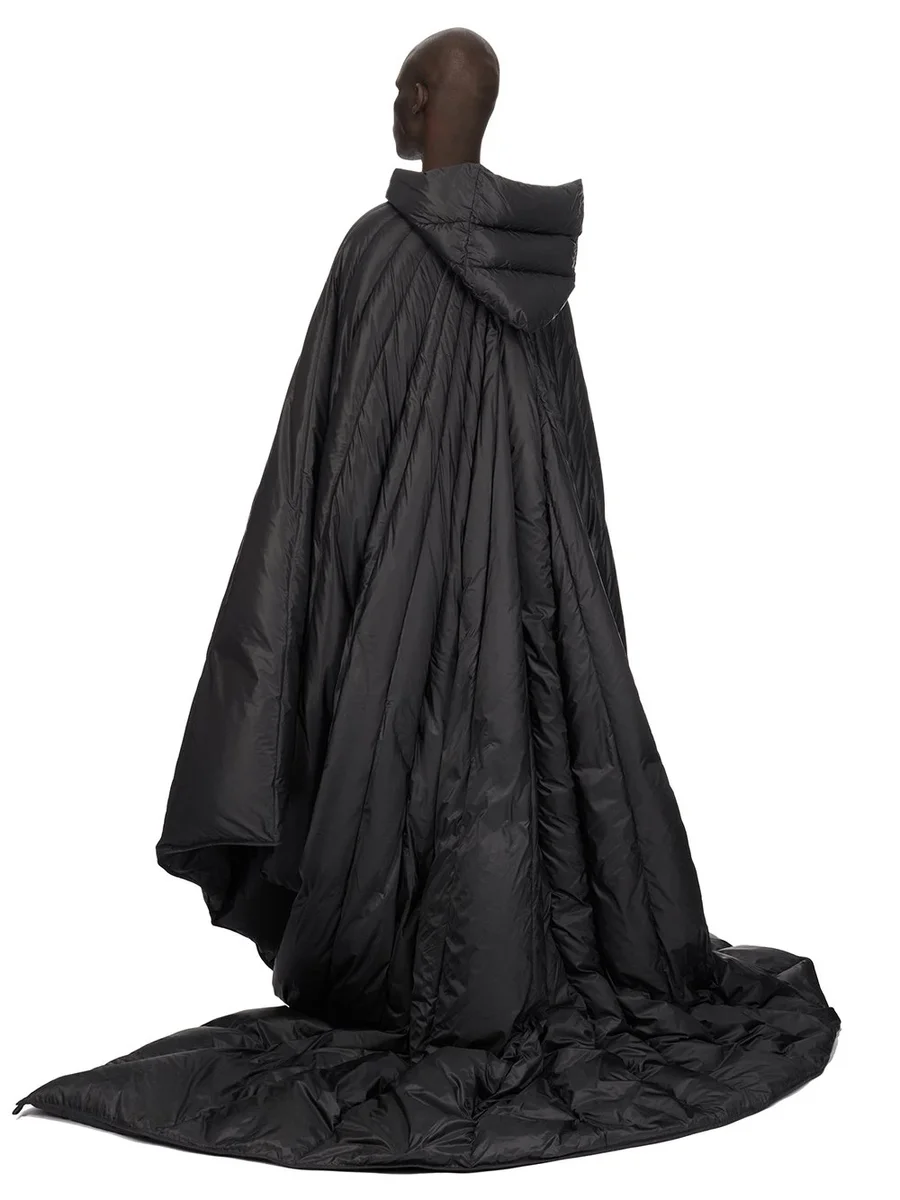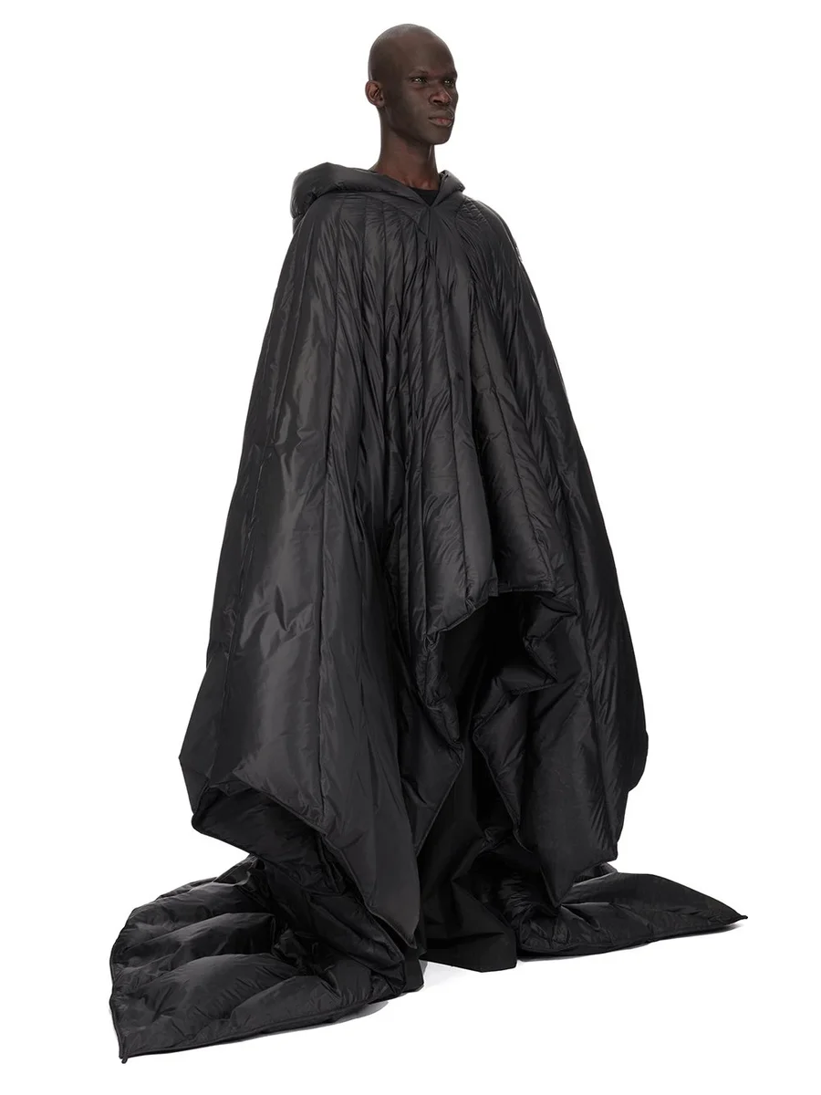 DENNA RADIANCE-FILT MED HUVA ÄR GOLFLÅNG. DEN HAR EN STOR REKTANGULÄR FORM MED EN MITTÖPPNING MED HUVA SOM BÄRS ÖVER HUVUDET SOM EN PONCHO. DEN DRAPERAR ÖVER AXLARNA OCH SKAPAR EN FÅLL SOM DOPPAR I SIDORNA. DET ÄR EN TÄCKESTIL SOM HAR EN RADIANCE-QUILTNINGSDESIGN, MED LINJER SOM UTSTRÅLAR FRÅN AXLARNA OCH UTÖKAR SIG MOT FÅLLEN. DEN HAR MONCLER + RICK OWENS BRODERAD LOGOTYP PÅ ÖVRE VÄNSTER ÄRM.