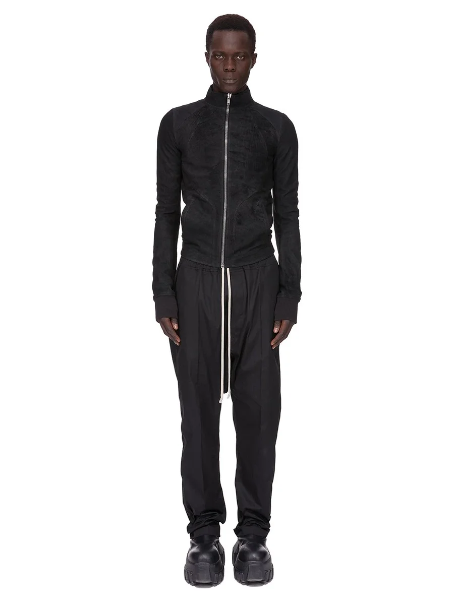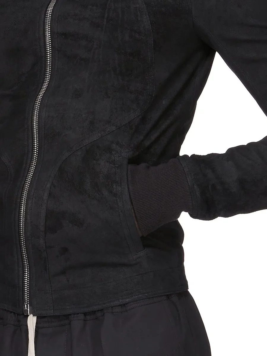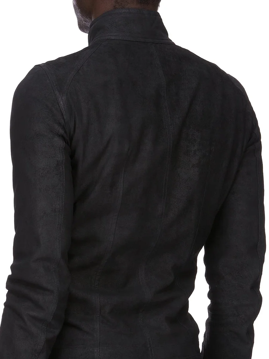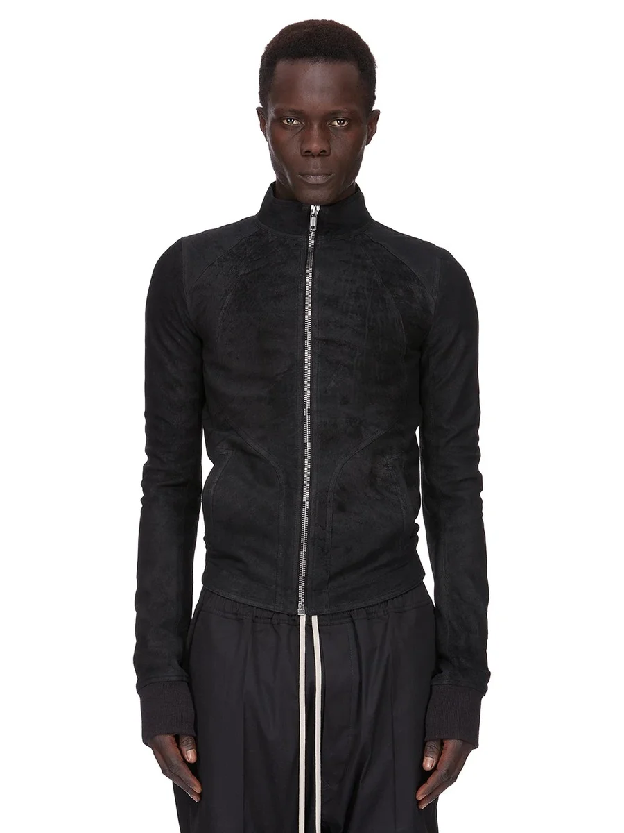 RICK OWENS FOREVER INTARSIA HÖG HALSAD JACKA I SVART BLISTERLAMMSKINN