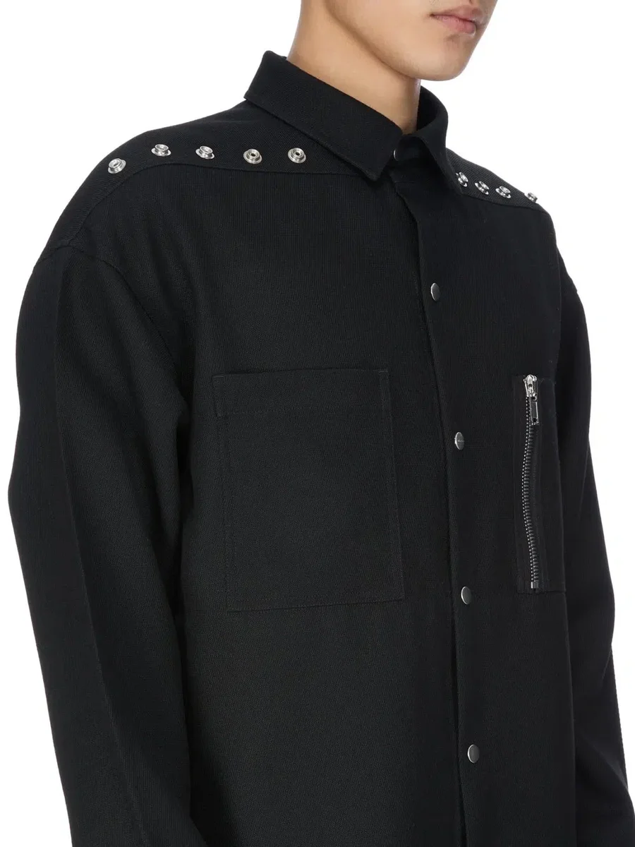 DENNA ÖVERSIZED YTTERSKJORTA ÄR LÅNG TILL MITT PÅ LÅRET MED EN ÖVERSIZED BOXY PASSFORM. DEN HAR EN MITT FRAMÖPPNING MED SYNLIGA KNÄPP, EN KLASSISK SKJORTCRAGE, FASAD SIDOSÖMMAR, MUDSKNÄPP OCH DUBBLA KOPPSÖMNINGAR. DEN HAR EN FYRKANTIG BRÖSTFICKA OCH EN VERTIKALISK FICKA MED DRAGKEDJA PÅ VÄNSTER. DEN HAR DE SIGNATURELLA AXELSÖMMARNA, MED FEM KNAPPDETALJER OCH ETT BOMULLSREM MED NITDETALJER PÅ BAKSTYGET.