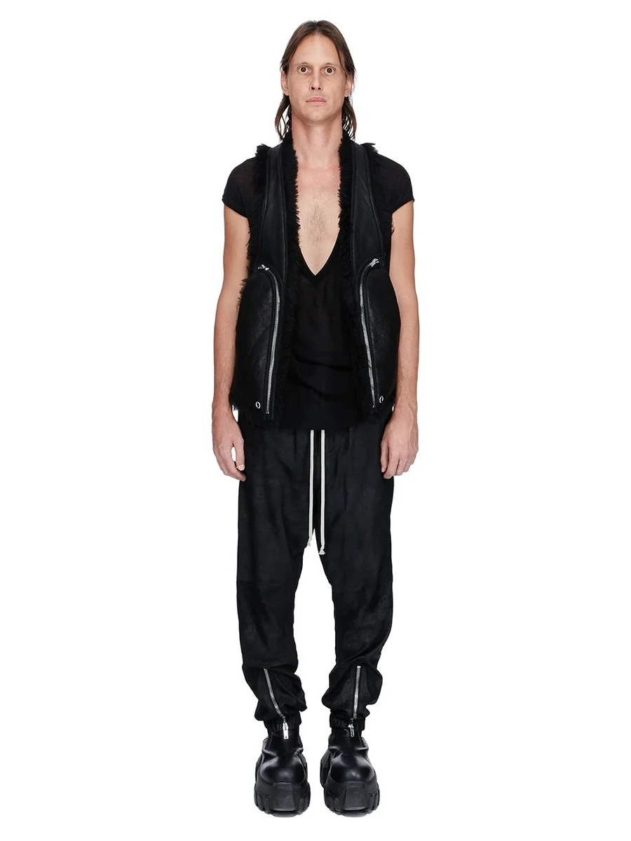 RICK OWENS FW25 CONCORDIANS BAUHAUS-VÄST I SVART LOCKIGT FÅLLSLIDER