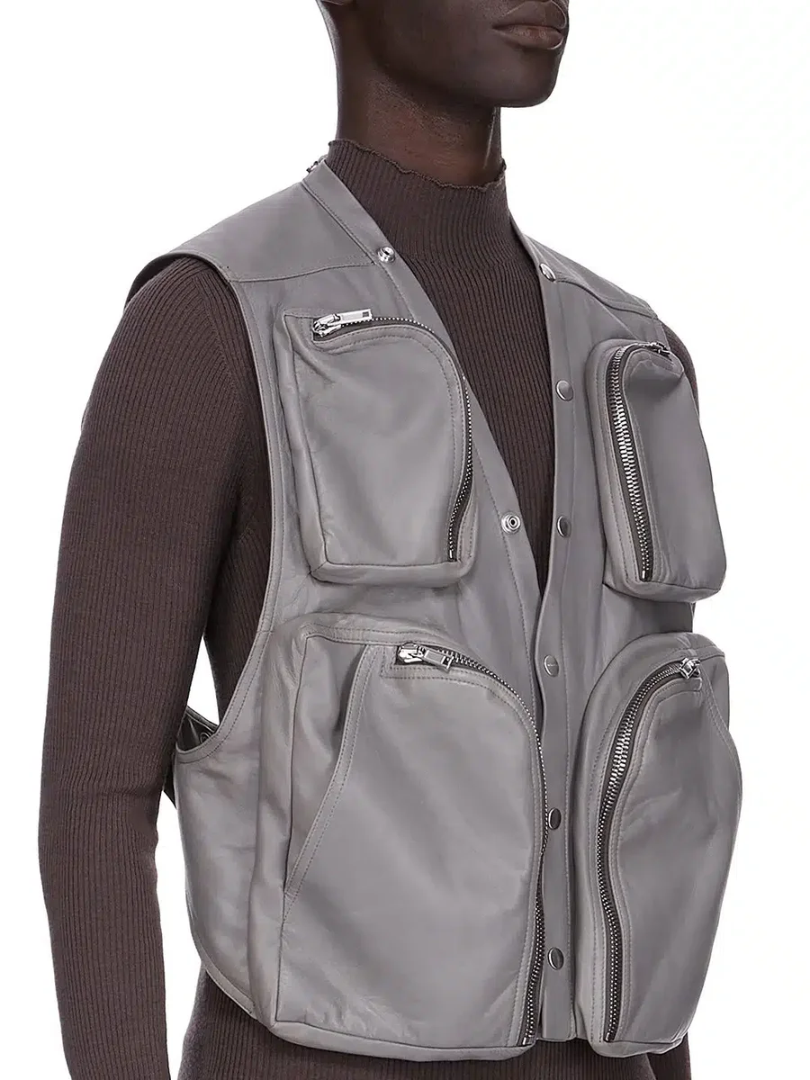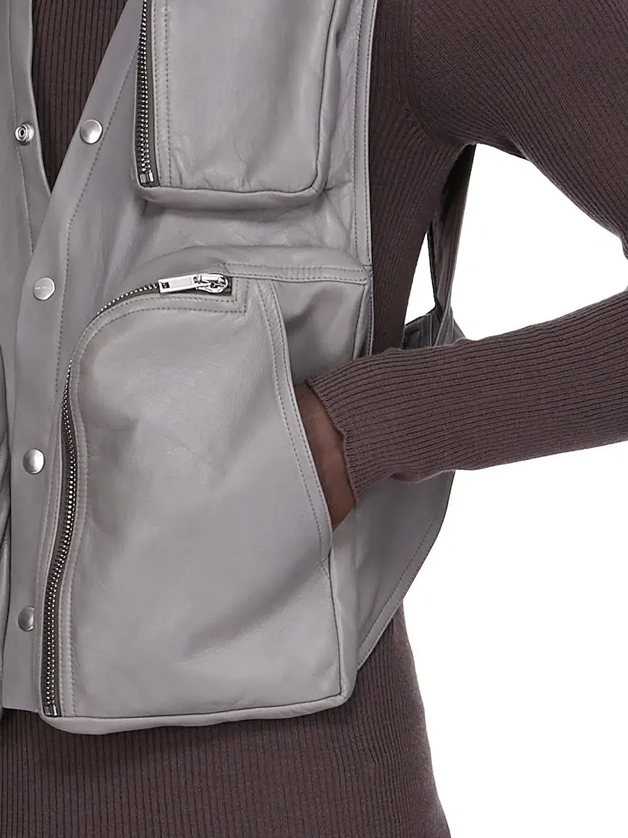 DENNA CARGOVÄST ÄR LÅNG TILL HÖFT OCH ÄRMLÖS. DEN HAR EN DJUP V-HALS MED TRE FUNKTIONELLA SYNLIGA KNÄPP OCH KNÄPP SOM FORTSÄTTER RUNT TILL DEN MITTA BAKADE HALSEN. DEN HAR RUNDADE BAUHAUS-FICKOR FÖR PALLARNA MED DRAGKEDJOR, TVÅ STORA PÅ SIDORNA AV BRÖSTET OCH TVÅ MINDRE PÅ VARJE SIDA OM BRÖSTET. DEN HAR JÄVLA AXELSÖMMAR OCH EN ÖPPEN RYGG SOM FÄSTES MED ETT MITT KNÄPPBÄLT.