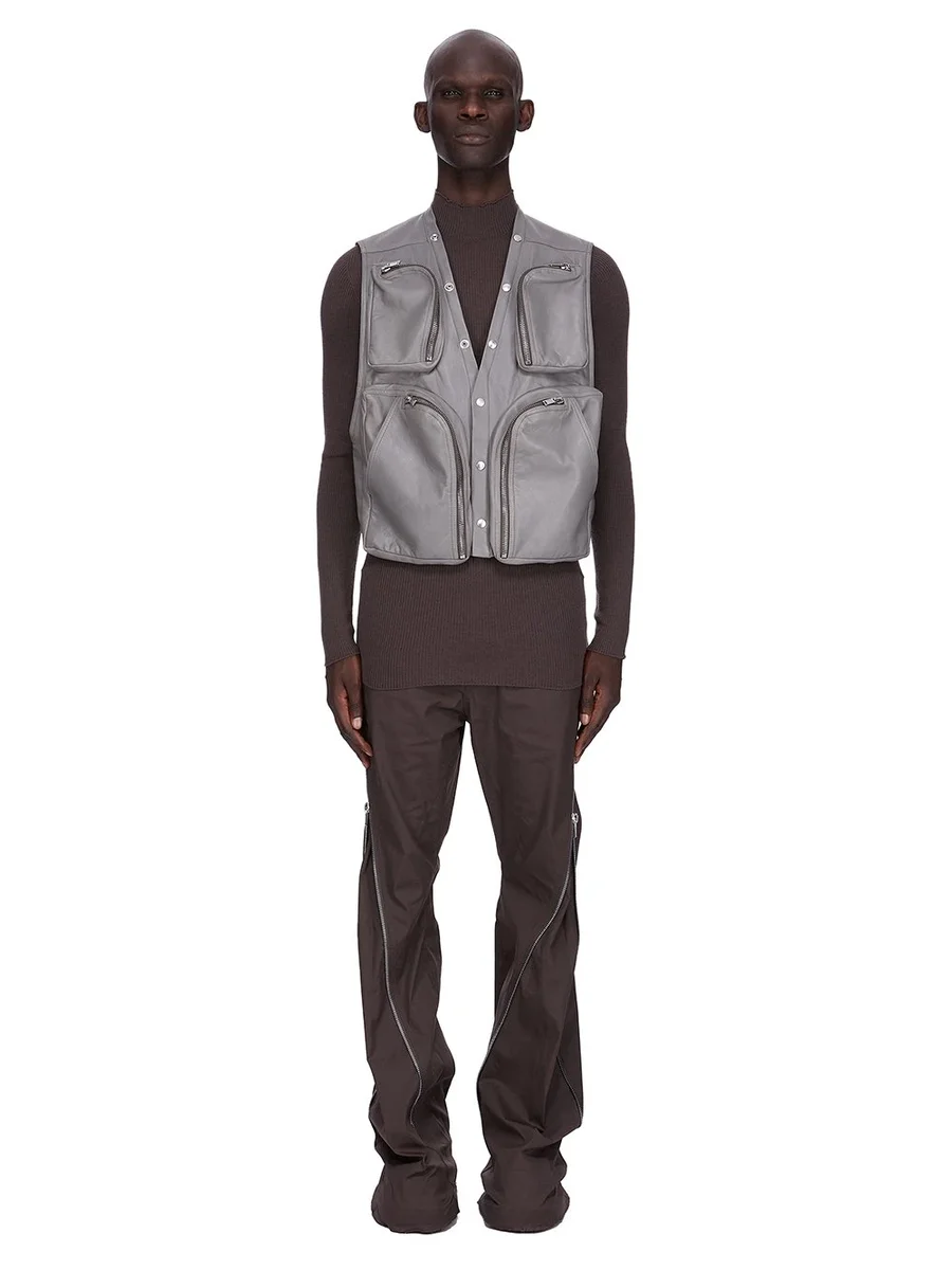 RICK OWENS FW25 CONCORDIANS CARGOVÄST I TVÄTTAT INDIGO VAXIGT LAMMSKINN