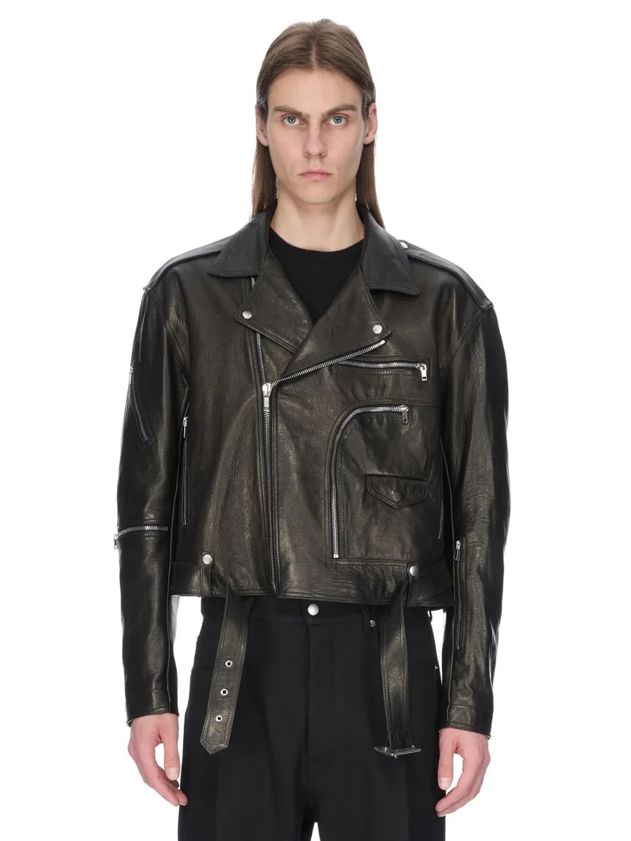 DESSA BORGADE JUMBO BAUHAUS STOOGES ÄR LÅNGA ÖVER HÖFTEN MED LÅNGA ÄRMAR OCH EN OVERSIZED PASSFORM. DEN HAR EN BIKER-DUBBELKNÄPPT FRAMSTÄLLNING MED EXCENTRUM DRAGKNÄPPNING, BRED KRAGE OCH SLAG MED SILVERKNÄPP. DEN HAR EN RUNDAD BAUHAUS-FICKA MED DRAGKNÄPP PÅ VÄNSTER SIDA AV KROPPEN OCH EN EXTRA FICKA MED FLAK SOM FÄSTES MED EN DOLD KNÄPPNING. DEN HAR SIDFICKOR MED DRAGKEDJA PÅ OCH BAKSIDOFICKOR, EN DIAGONAL FICKA MED DRAGKEDJA PÅ ÖVRE HÖGER ARM SAMT EN HORISONTELL DRAGKEDJA VID ARMBÅGEN OCH EN FICKA MED DRAGKEDJA PÅ VÄNSTER UNDERARM. DEN HAR DRAGKEDJEÖPPNINGAR VID MUSSERNA, AXELSKJORTOR MED KNÄPPDETALJER OCH ETT SKÄLTE SOM LÖPER GENOM BÄLTESHÄLLOR I MIDJAN.