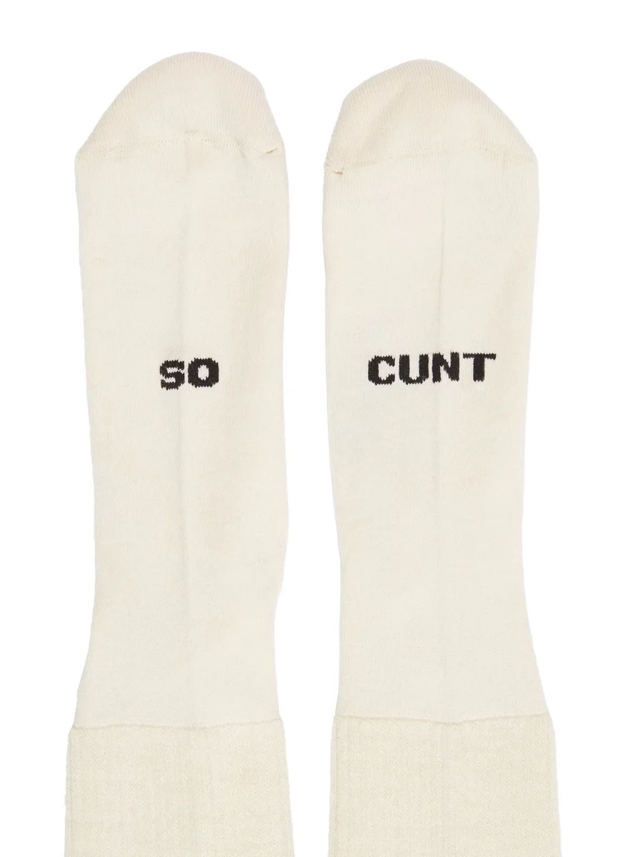 DESSA SO CUNT-STRUMPOJKOR ÄR MELLAN VAD. DE HAR ORDET ”SO” PÅ VÄNSTER STRUMPA OCH ”CUNT” PÅ HÖGER STRUMPA. DE HAR ÄVEN ORDET ”RICK OWENS” PÅ NEDERSIDEN AV HÖGER STRUMPA.