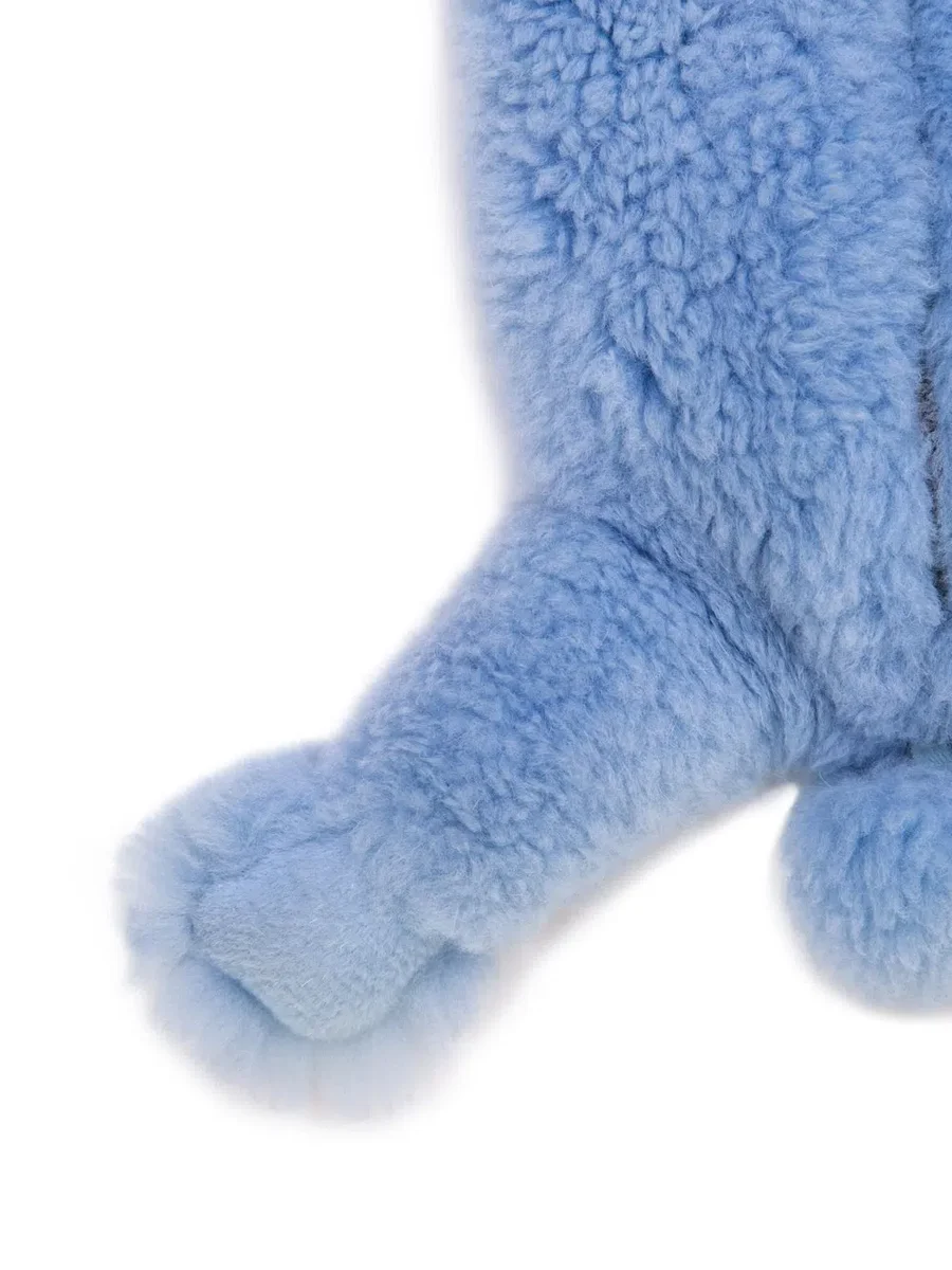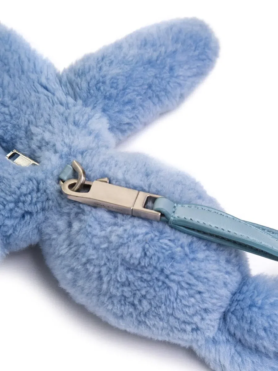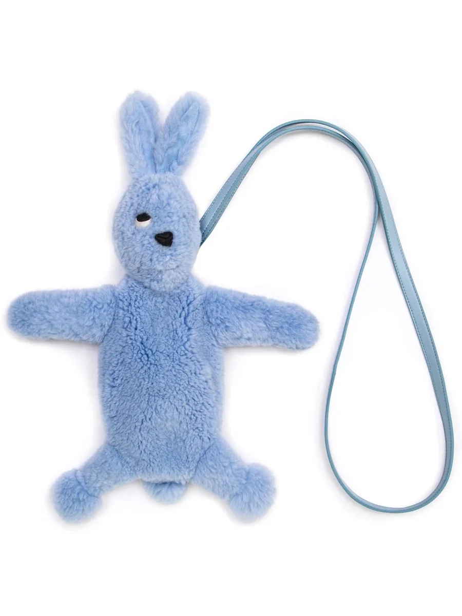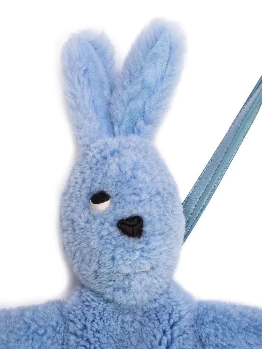 RICK OWENS HUN FAT BUNNY I POWDERBLÅT HAR EN NUTRIA-PÄLSKROPP, ETT ÖGA, EN NÄSA, TVÅ TÄNDER, LÅNGA ÖRON, EN HEMLIG FICKSA MED DRAGKEDJA PÅ BACKEN OCH EN AVTAGBAR TUNN AXELREM. DEN HAR ÄVEN FUNKTIONEN SOM EN LITEN VÄSKA.
