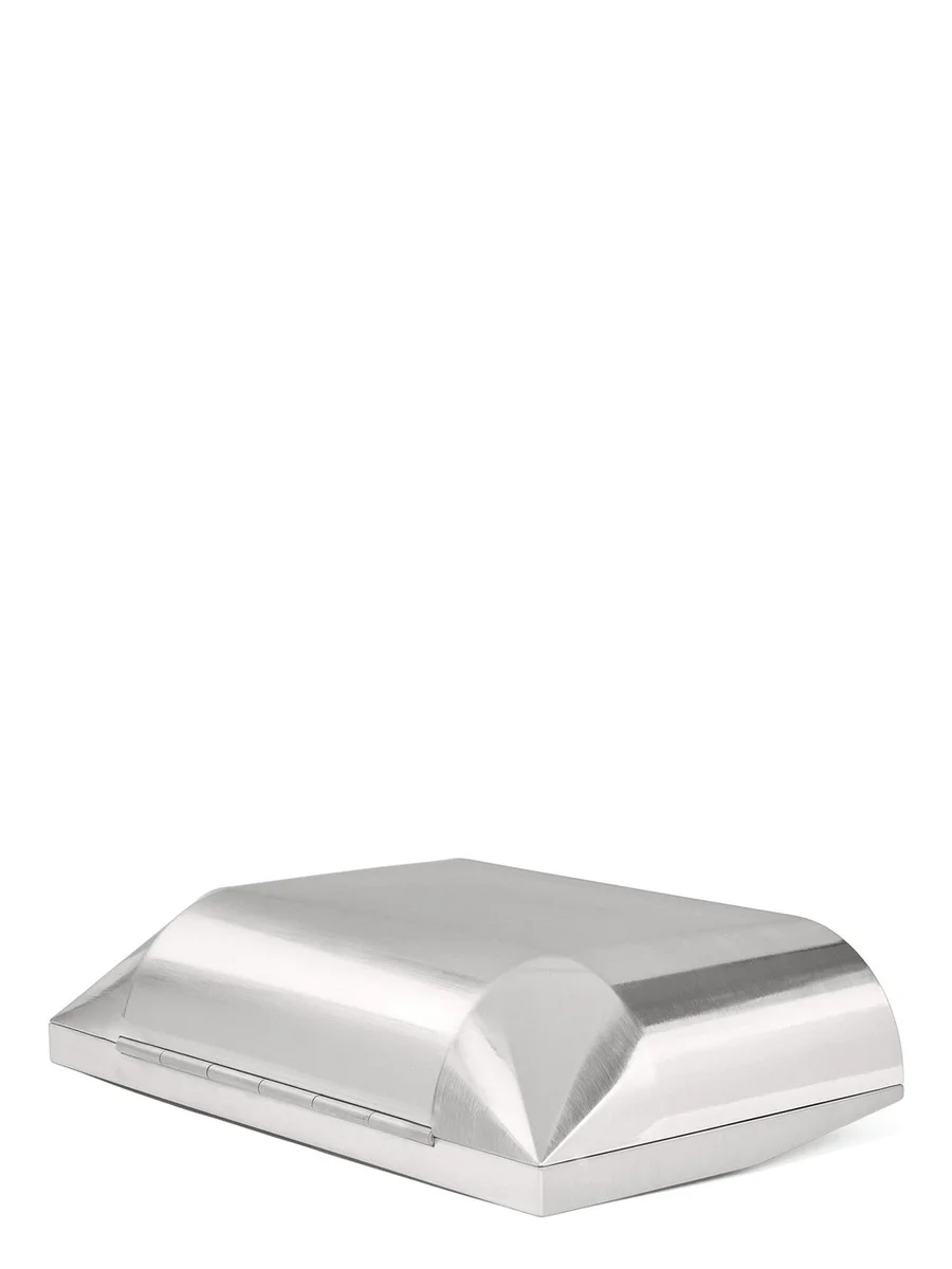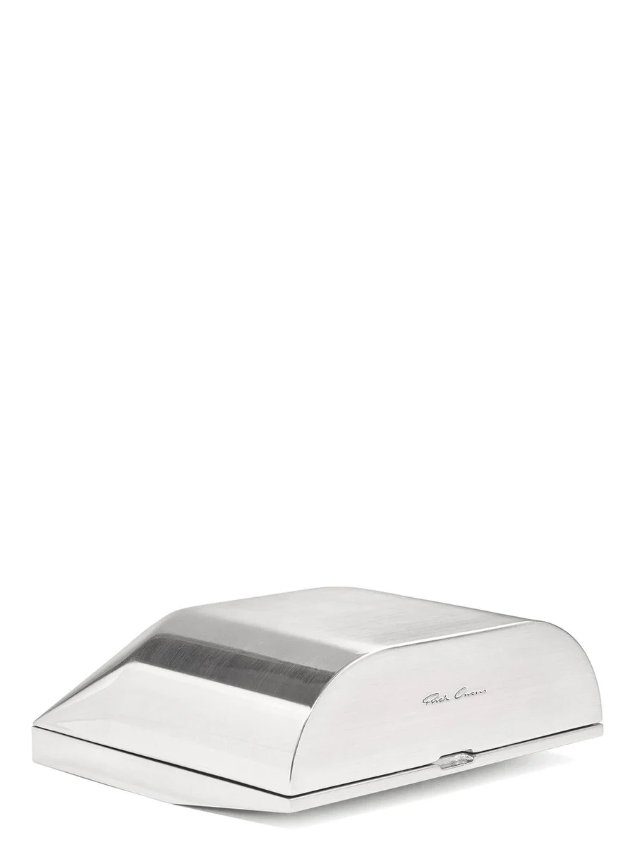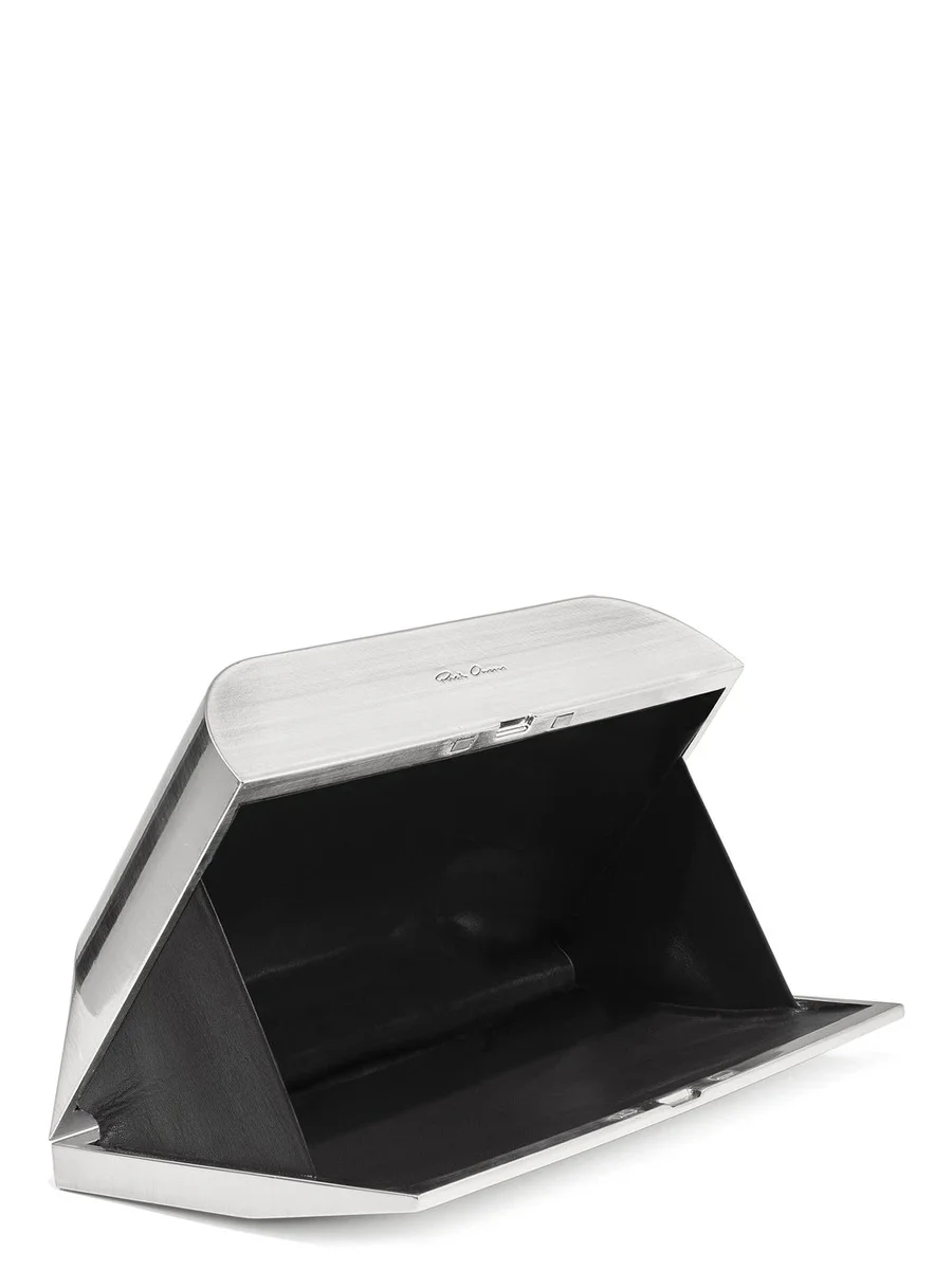 DENNA CLUTCH MED STORA GRIPPOR ÄR EN HÅRD METALLVÄSKA MED PLAT BOTTEN OCH RUNDAD FORM MED FASAD HÖRN. DEN HAR GÅNGJÄRNÖPPNING OCH INSIDA I LÄDER. DEN HAR RICK OWENS-LOGOTYPEN GRAVERAD PÅ OVANSTÅSEN.