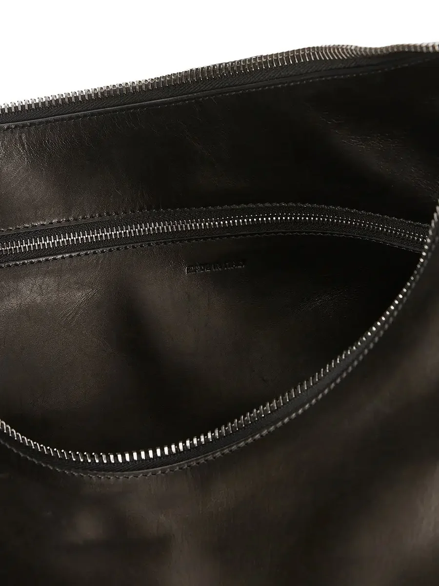 DENNA GEMINI-VÄSKA ÄR EN STOR, MJUK A-FORMAD VÄSKA SOM SLUTAR SIG I MITTEN. DEN SVÄCKER SIG NER FÖR ATT SKAPA EN REM SOM FÄSTES MED EN GEMINI DUBBELKARBINARKROK MED RICK OWENS-LOGOTYPEN GRAVERAD. VÄSKAN ÖPPNAS MED EN DRAGKEDJA ÖVERST, HAR EN INNERFICKA OCH EN PLAT FICKA MED U-FORMAD SÖMMNING SYNLIG PÅ BAKSIDA UTSIDA.