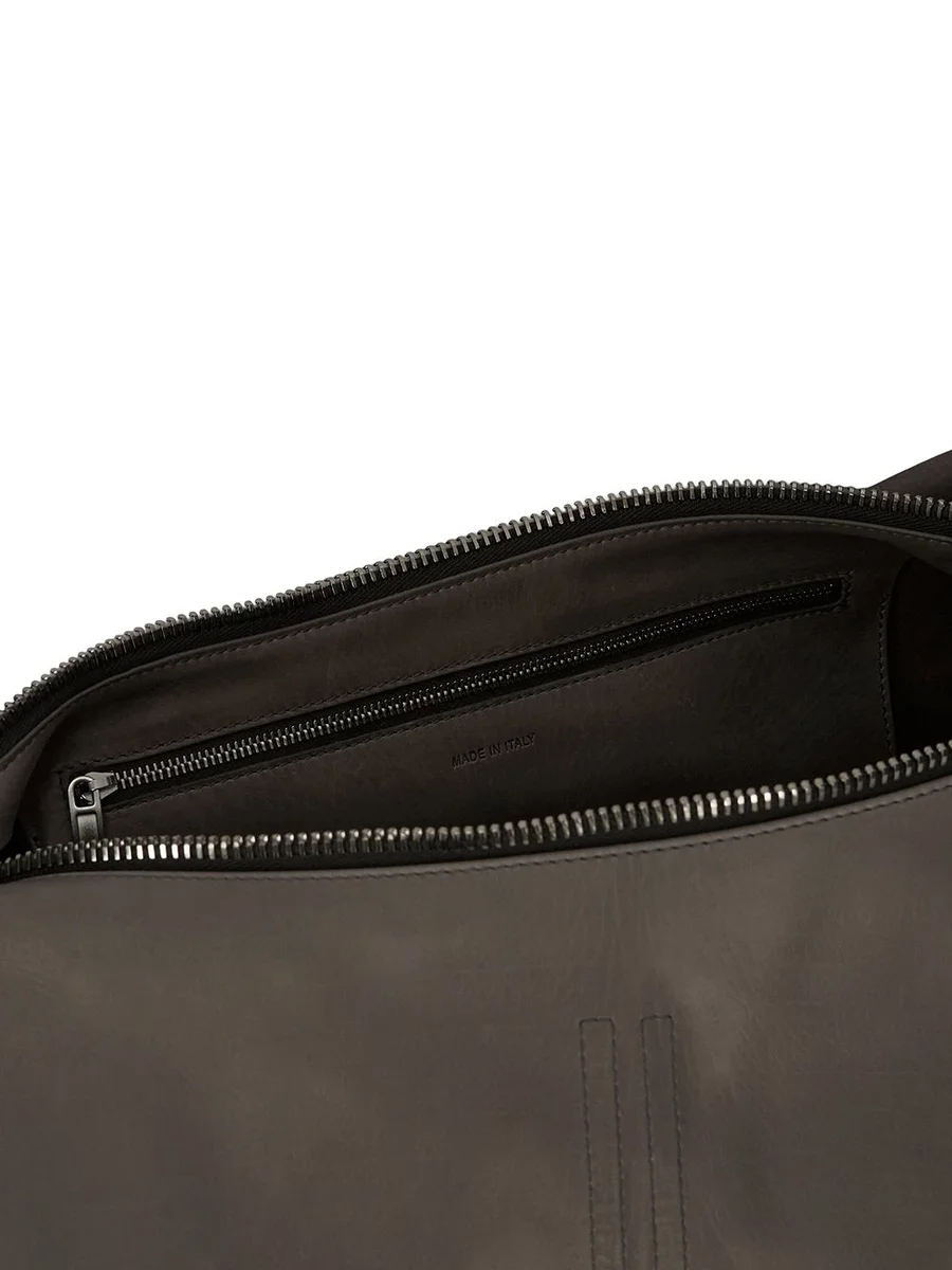DENNA GEMINI CROPPED-VÄSKA ÄR EN MINDRE VERSION AV VÅR STORA GEMINI-VÄSKA. DET ÄR EN MJUK A-FORMAD VÄSKA SOM SLUTAR SIG I MITTEN. DEN BÖJER SIG NER FÖR ATT SKAPA EN REM SOM FÄSTES MED EN GEMINI DUBBELKARBIKA MED RICK OWENS-LOGOTYPEN GRAVERAD. VÄSKAN ÖPPNAS MED EN DRAGKEDJA ÖVERST, HAR EN INNERFICKA OCH EN PLAT FICKA MED U-FORMAD SÖMMNING SYNLIG PÅ BAKSIDA UTSIDA.