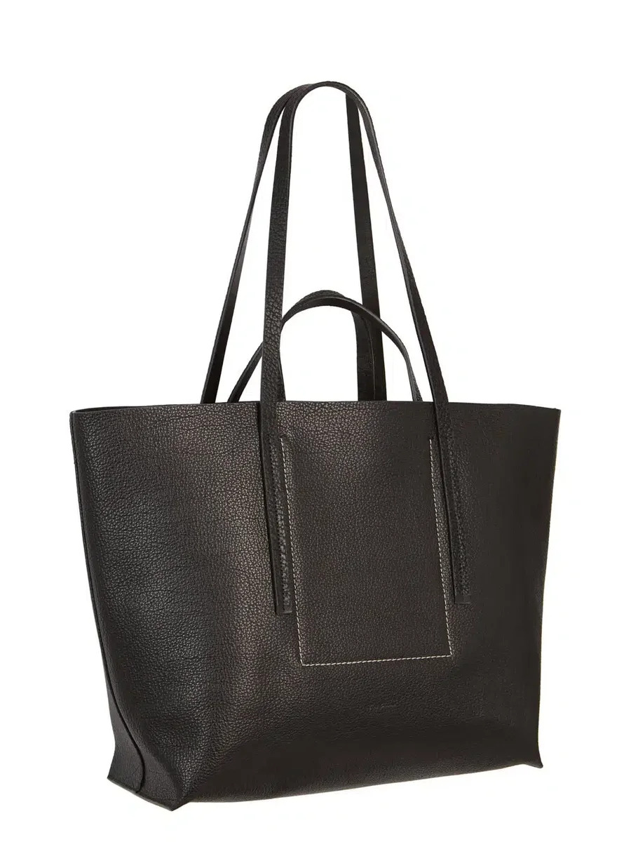 DENNA SHOPPER ÄR EN HORISONTELL REKTANGULÄR TOTE-VÄSKA MED ÖPPEN TOPP. DEN HAR TVÅ LÅNGA HANDTAG AVSEDDA FÖR ATT BÄRA PÅ AXELN OCH TVÅ KORTA HANDTAG. DEN HAR EN INNERFICKA MED DRAGKEDJA OCH EN PLAT INNERFICKA MED TYPISKT U-FORMAD SÖMMNINGSDETALJ SYNLIG PÅ FRAMSIDA. DEN ÄR PRÄGD MED RICK OWENS-LOGOTYPEN.