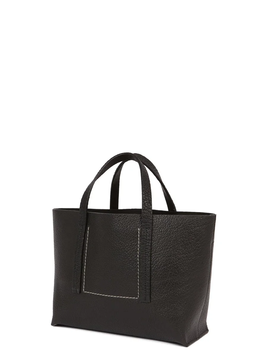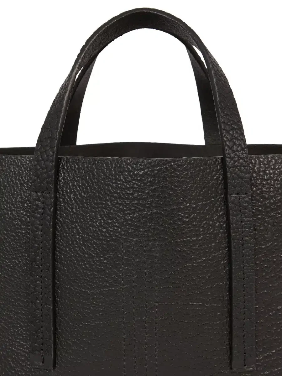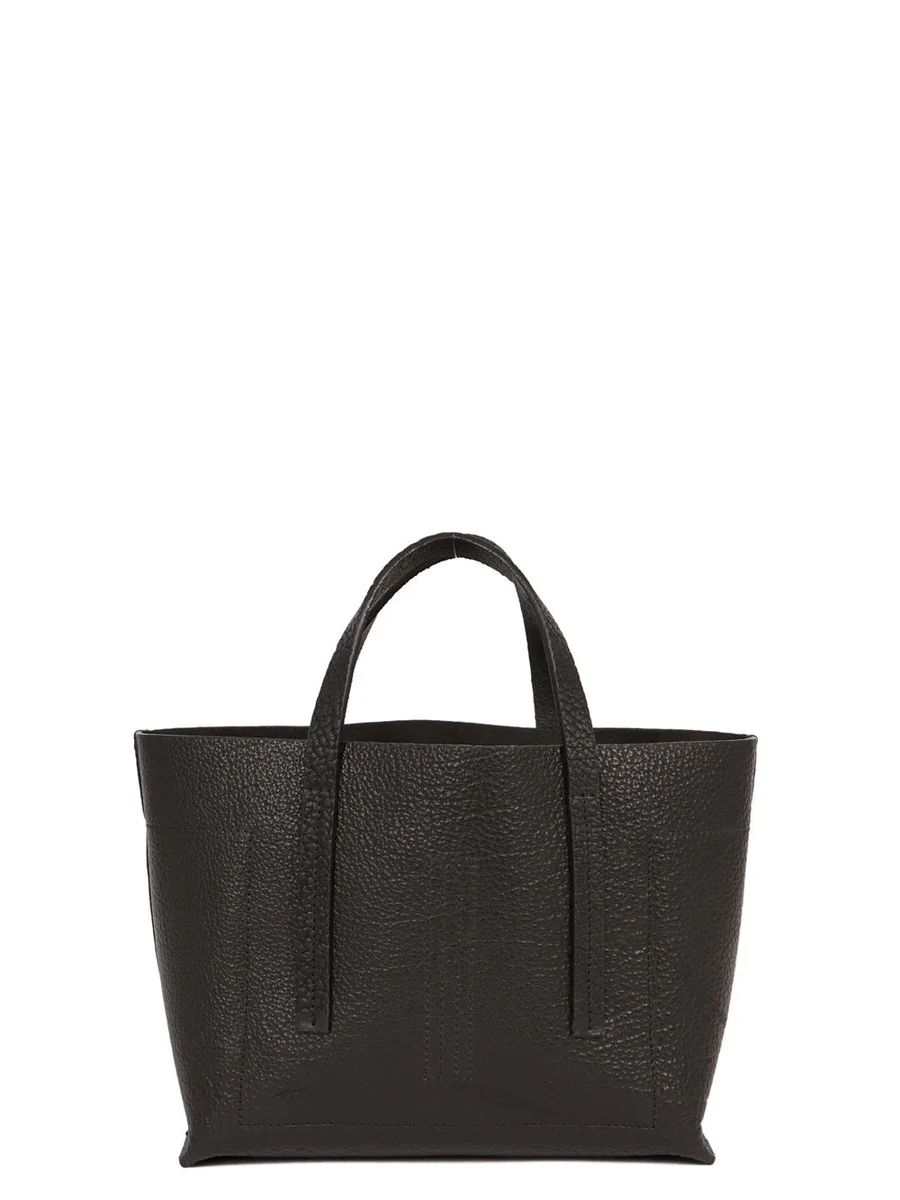 DENNA MINI SHOPPER ÄR EN HORISONTELL REKTANGULÄR VÄSKA MED TVÅ KORTA BÄRHANDTAG OCH EN ÖPPEN TOPP. DEN HAR EN INNERFICKA MED DRAGKEDJA OCH EN PLAT INNERFICKA MED TYPISKT U-FORMAT SÖMMDETALJ SYNLIGT PÅ FRAMSIDA. DEN ÄR PRÄGD MED RICK OWENS-LOGOTYPEN.