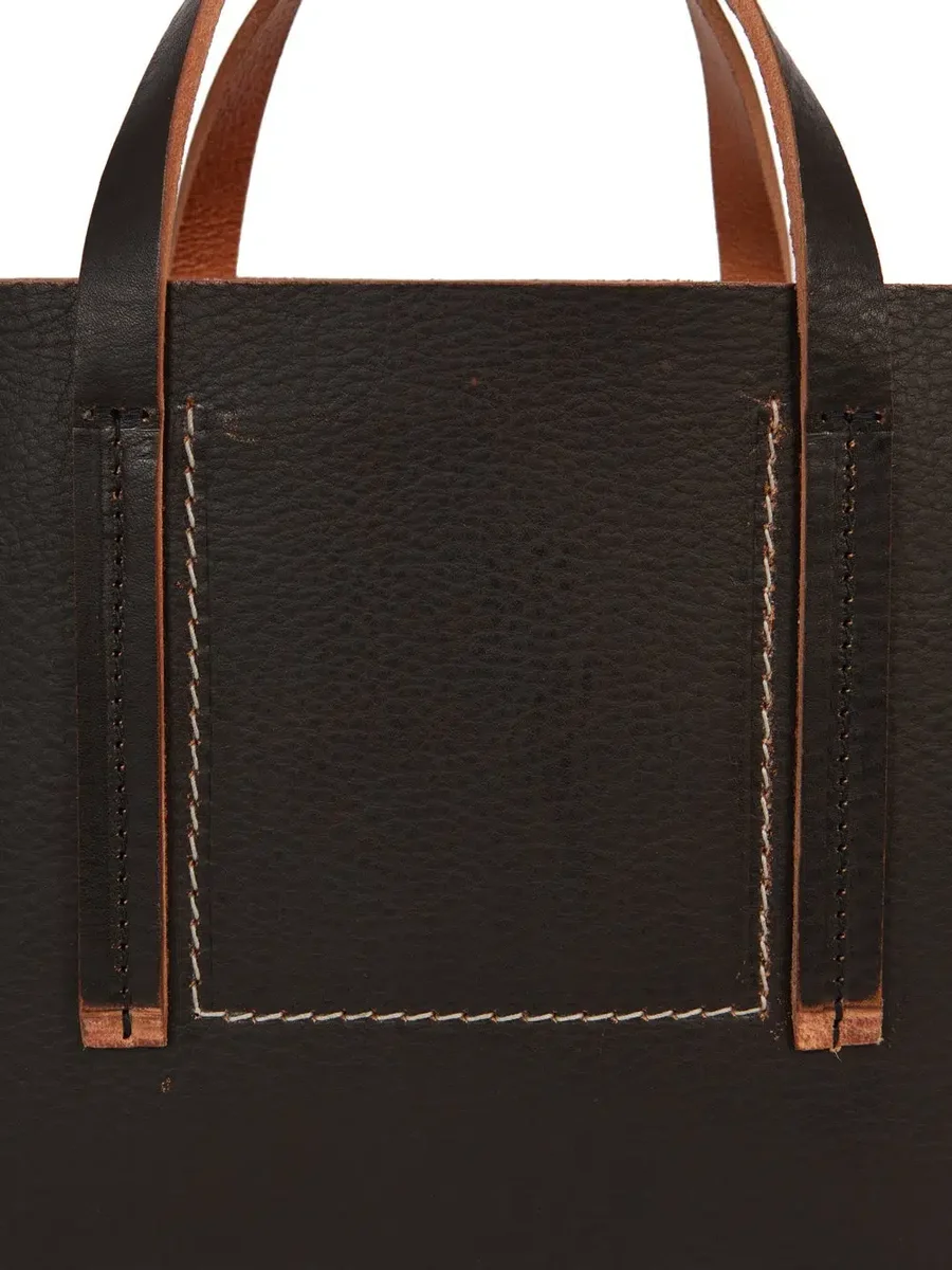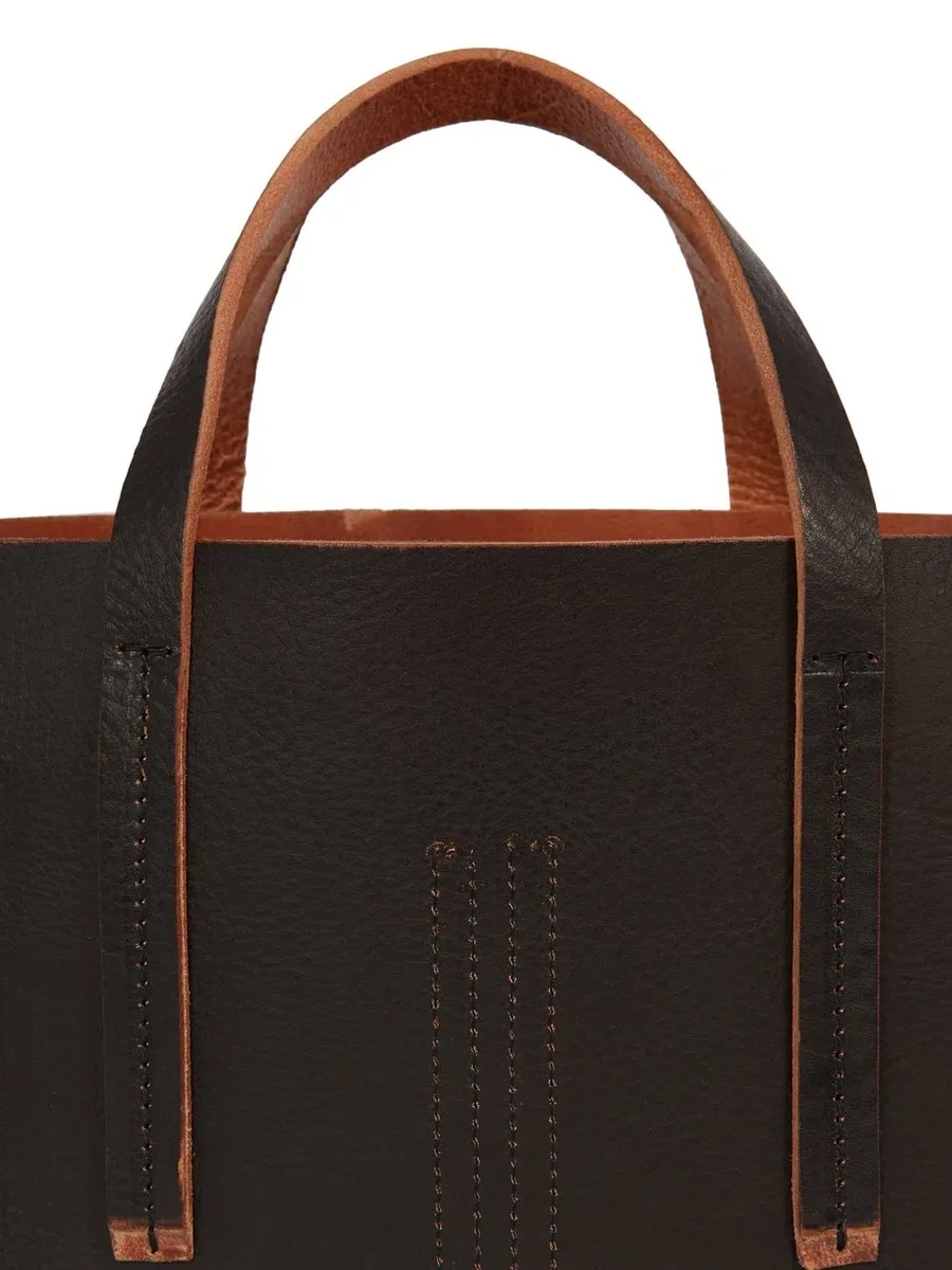 DENNA MINI SHOPPER ÄR EN HORISONTELL REKTANGULÄR VÄSKA MED TVÅ KORTA BÄRHANDTAG OCH ÖPPEN TOPP. DEN HAR EN INNERFICKA MED DRAGKEDJA OCH EN PLAT INNERFICKA MED TYPISKT U-FORMAT SÖMM SYNLIGT PÅ FRAMSIDA. DEN ÄR PRÄGAD MED RICK OWENS-LOGOTYPEN.